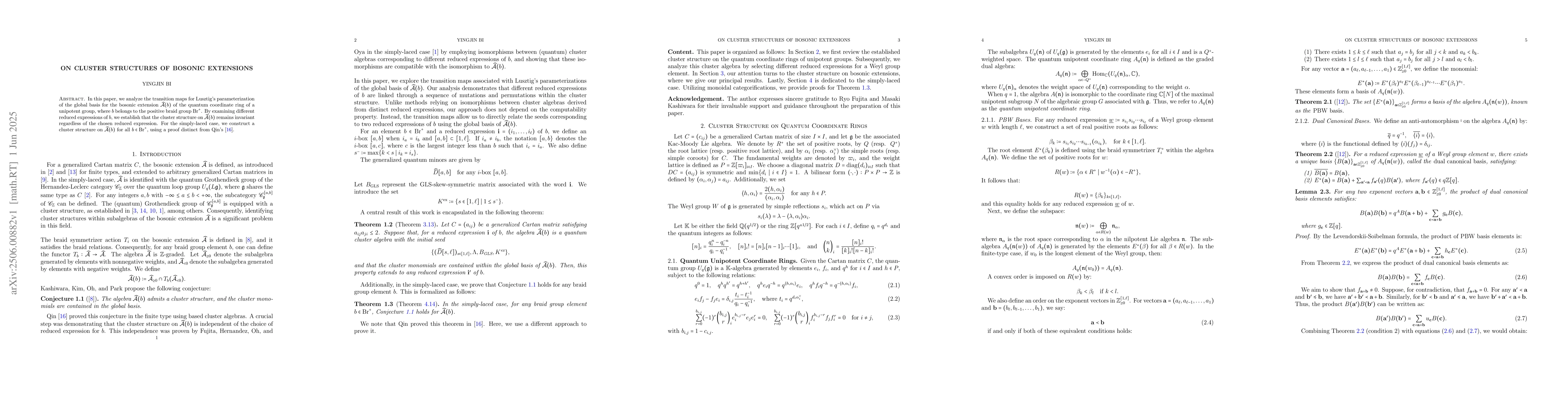 Establishment of cluster structure invariance for bosonic extensions under Lusztig's parameterization and construction of a cluster structure for all $b \in \operatorname{Br}^+$ in the simply-laced case.