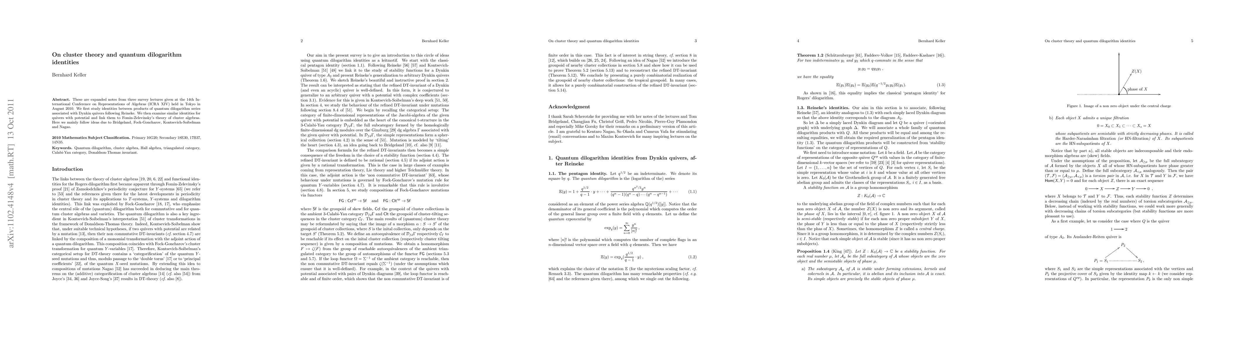 These are expanded notes from three survey lectures given at the 14th International Conference on Representations of Algebras (ICRA XIV) held in Tokyo in August 2010. We first study identities between products of quantum dilogarithm series associated with Dynkin quivers following Reineke. We then examine similar identities for quivers with potential and link them to Fomin-Zelevinsky's theory of cluster algebras. Here we mainly follow ideas due to Bridgeland, Fock-Goncharov, Kontsevich-Soibelman and Nagao.