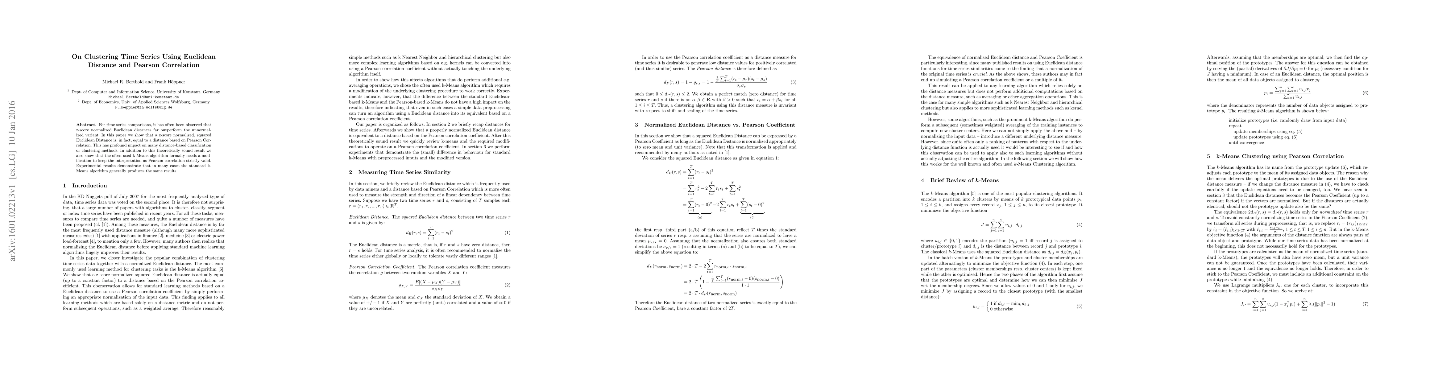 For time series comparisons, it has often been observed that z-score normalized Euclidean distances far outperform the unnormalized variant. In this paper we show that a z-score normalized, squared Euclidean Distance is, in fact, equal to a distance based on Pearson Correlation. This has profound impact on many distance-based classification or clustering methods. In addition to this theoretically sound result we also show that the often used k-Means algorithm formally needs a mod ification to keep the interpretation as Pearson correlation strictly valid. Experimental results demonstrate that in many cases the standard k-Means algorithm generally produces the same results.