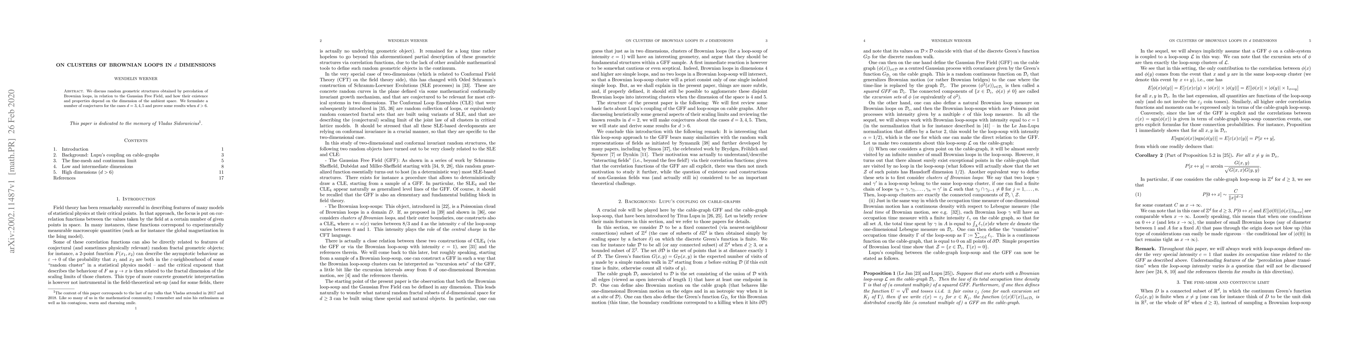 This paper explores random geometric structures formed by percolating Brownian loops and their connection to the Gaussian Free Field, focusing on how these structures' existence and properties vary with the dimension d. It formulates conjectures for dimensions d=3,4,5 and proves some results for d > 6.