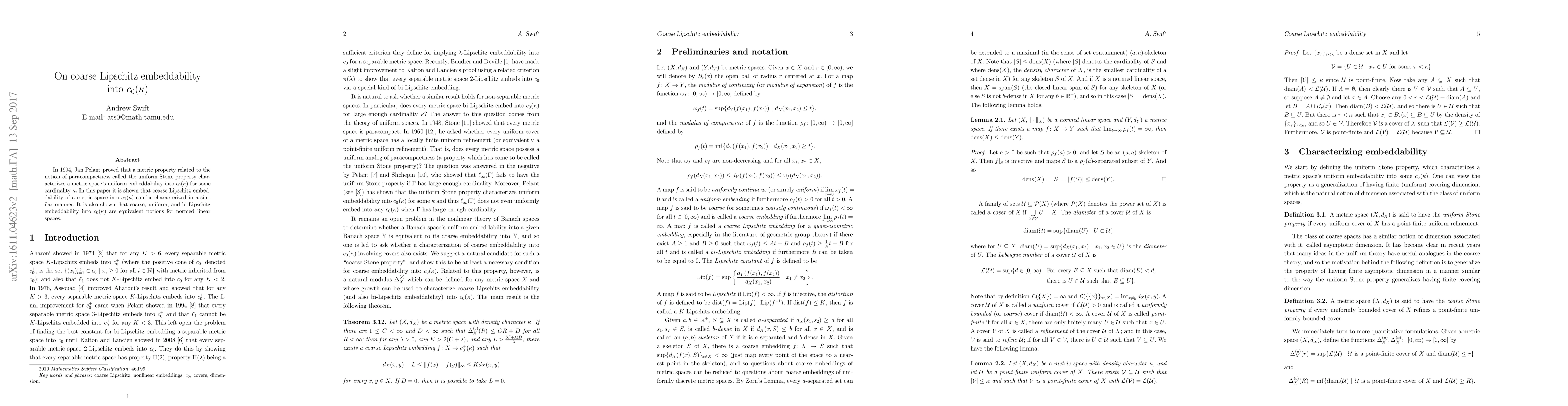 Summary: This paper demonstrates that coarse Lipschitz embeddability of a metric space into $c_0(\kappa)$ is characterized by a uniform Stone property. It also establishes the equivalence of coarse, uniform, and bi-Lipschitz embeddability into $c_0(\kappa)$ for normed linear spaces.
