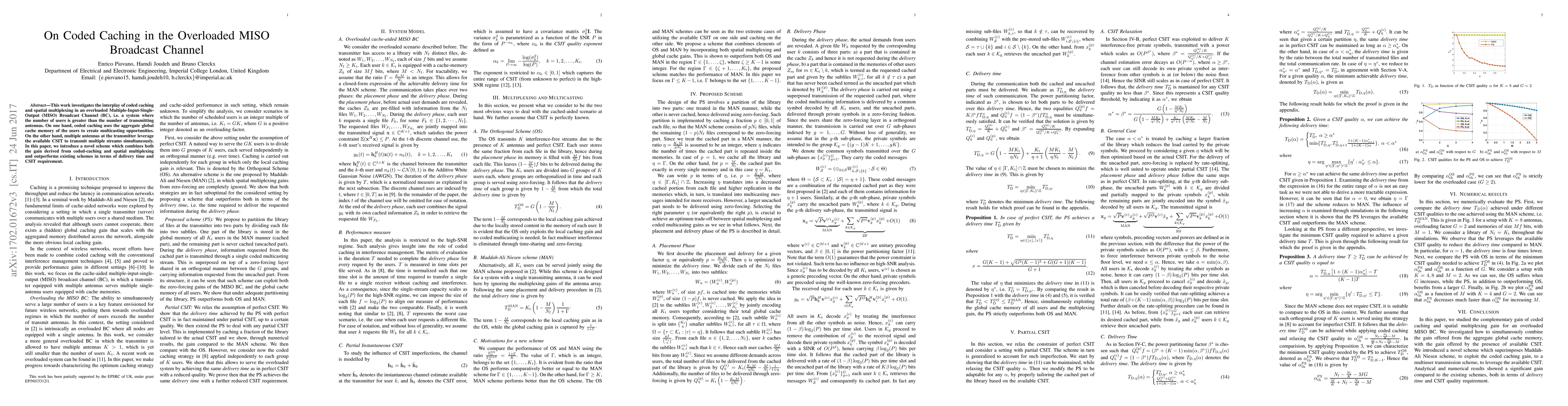 This paper proposes a novel scheme combining coded caching and spatial multiplexing in an overloaded MISO Broadcast Channel, achieving superior delivery time and lower CSIT requirements compared to existing methods.