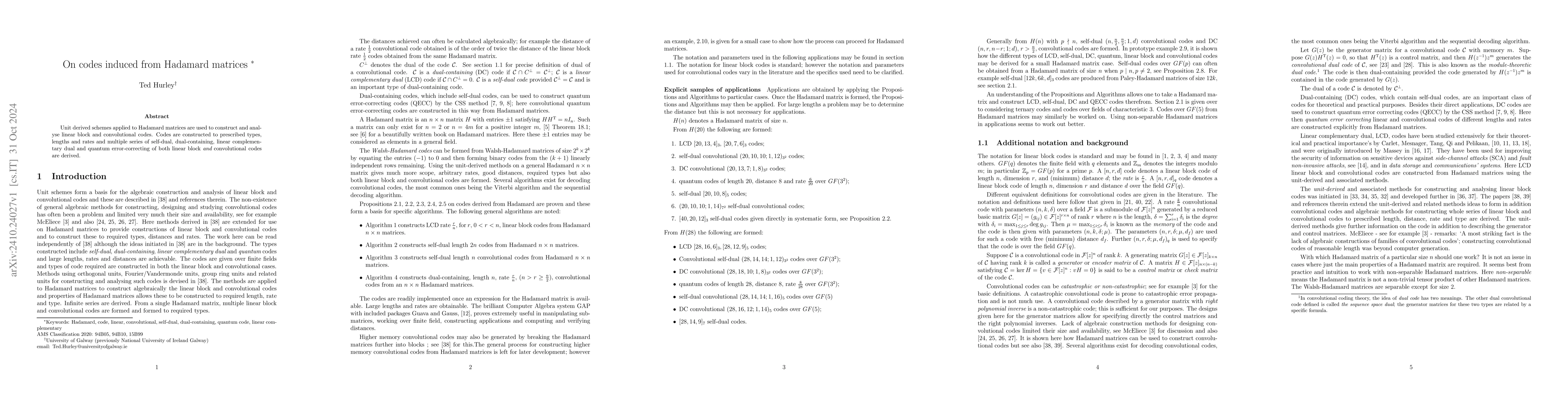 Unit derived schemes applied to Hadamard matrices are used to construct and analyse linear block and convolutional codes. Codes are constructed to prescribed types, lengths and rates and multiple series of self-dual, dual-containing, linear complementary dual and quantum error-correcting of both linear block {\em and} convolutional codes are derived.