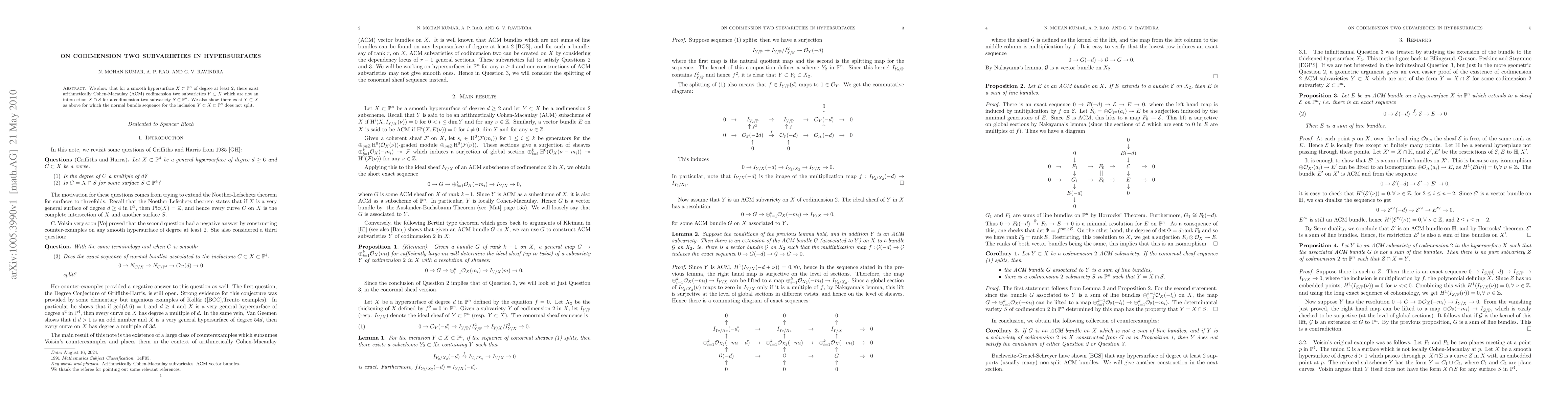 We show that for a smooth hypersurface $X\subset \bbP^n$ of degree at least 2, there exist arithmetically Cohen-Macaulay (ACM) codimension two subvarieties $Y\subset X$ which are not an intersection $X\cap{S}$ for a codimension two subvariety $S\subset\bbP^n$. We also show there exist $Y\subset X$ as above for which the normal bundle sequence for the inclusion $Y\subset X\subset\bbP^n$ does not split.