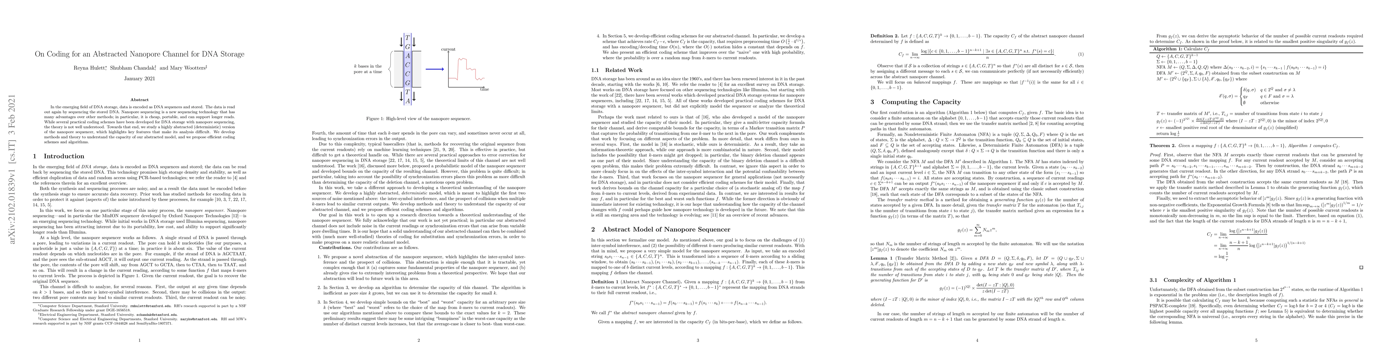 This paper explores theoretical aspects of coding for DNA storage using nanopore sequencing, focusing on an abstracted model to understand its capacity. It proposes efficient coding schemes and algorithms to enhance the practical application of DNA storage in nanopore sequencing.