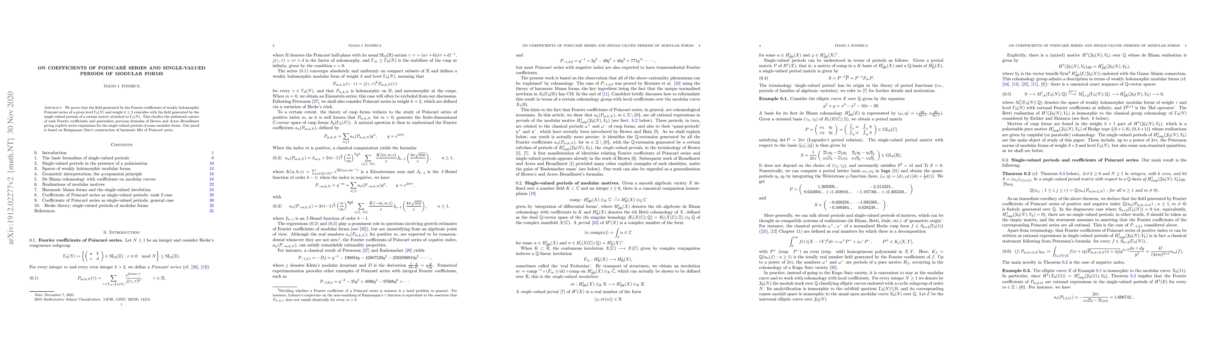We prove that the field generated by the Fourier coefficients of weakly holomorphic Poincar\'e series of a given level $\Gamma_0(N)$ and weight $k\ge 2$ coincides with the field generated by the single-valued periods of a certain motive attached to $\Gamma_0(N)$. This clarifies the arithmetic nature of such Fourier coefficients and generalises previous formulas of Brown and Acres--Broadhurst giving explicit series expansions for the single-valued periods of some modular forms. Our proof is based on Bringmann--Ono's construction of harmonic lifts of Poincar\'e series.