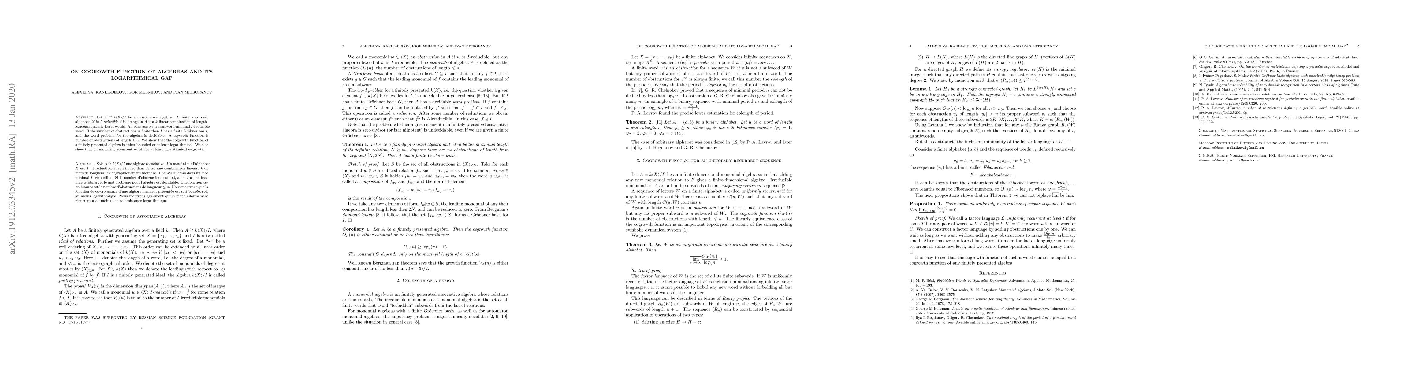 This paper investigates the cogrowth function of finitely presented associative algebras, demonstrating that it is either bounded or grows at least logarithmically. It also proves that uniformly recurrent words exhibit a minimum logarithmical cogrowth.