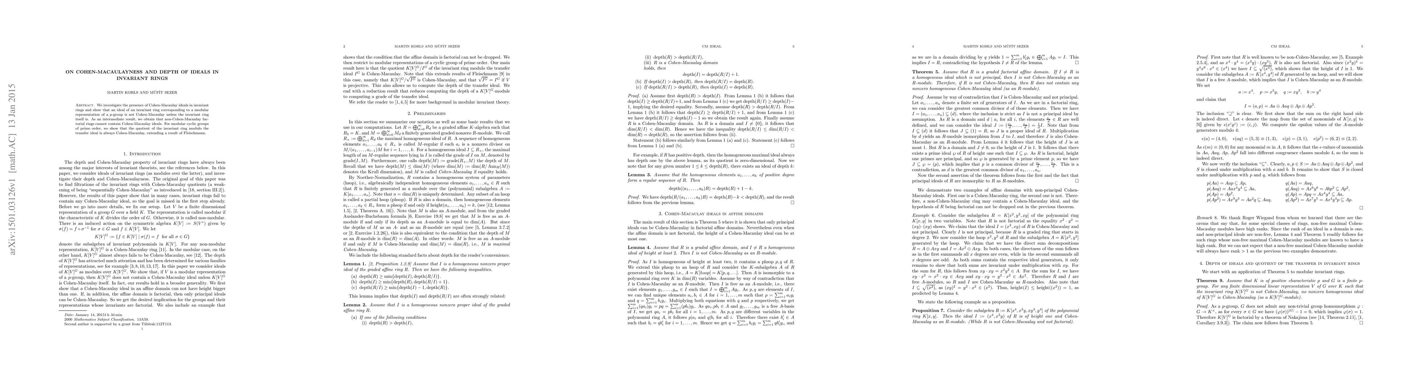 We investigate the presence of Cohen-Macaulay ideals in invariant rings and show that an ideal of an invariant ring corresponding to a modular representation of a $p$-group is not Cohen-Macaulay unless the invariant ring itself is. As an intermediate result, we obtain that non-Cohen-Macaulay factorial rings cannot contain Cohen-Macaulay ideals. For modular cyclic groups of prime order, we show that the quotient of the invariant ring modulo the transfer ideal is always Cohen-Macaulay, extending a result of Fleischmann.