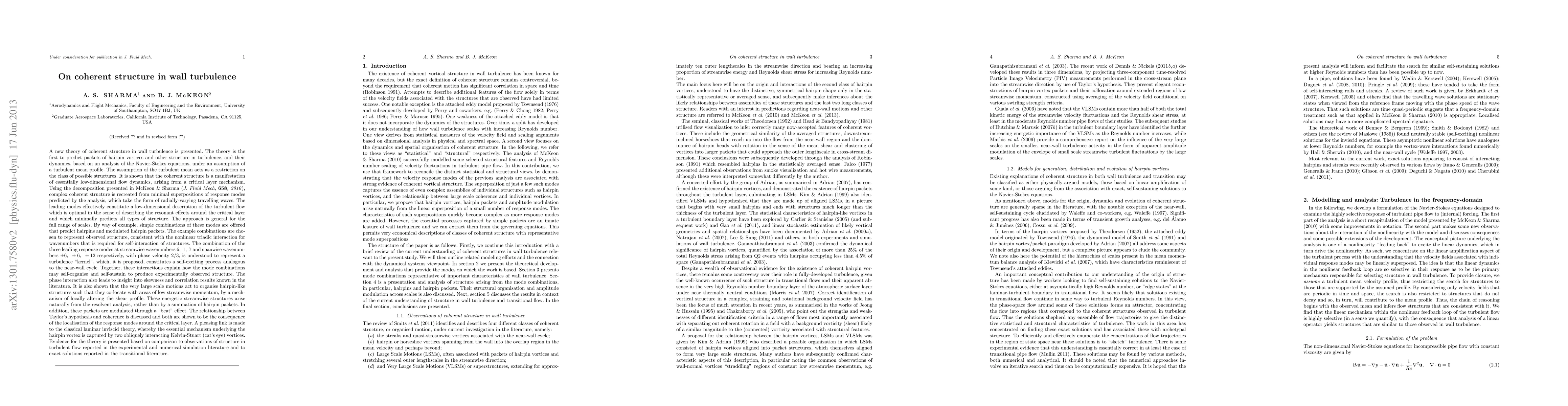 Researchers present a new theory of coherent structure in wall turbulence, predicting packets of hairpin vortices and their dynamics using Navier-Stokes equations analysis, which suggests essential low-dimensional flow dynamics and critical layer mechanism.