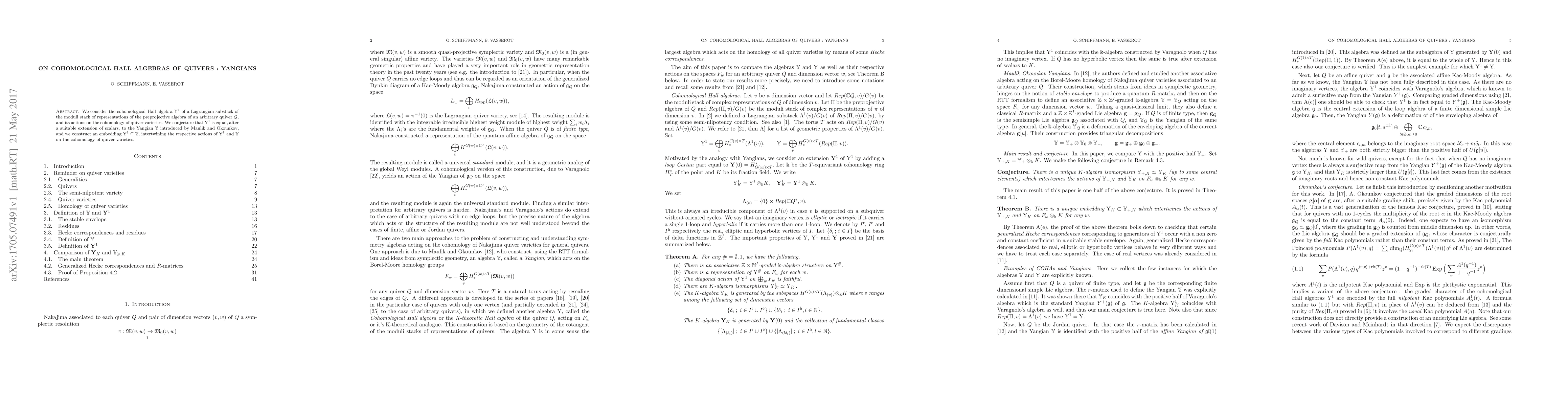 The paper investigates the cohomological Hall algebra (Y) of a Lagrangian substack of the moduli stack of representations of the preprojective algebra of an arbitrary quiver Q, focusing on its actions on the cohomology of quiver varieties. The authors conjecture that Y is equal to the Yangian introduced by Maulik and Okounkov, and construct an embedding of Y in the Yangian, intertwining their respective actions on cohomology.
