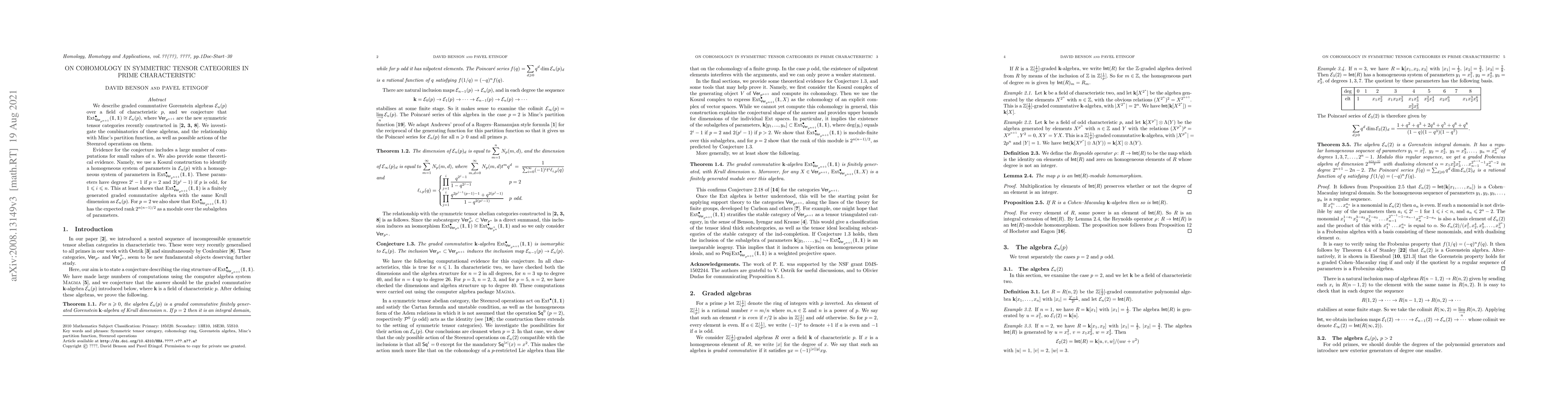We describe graded commutative Gorenstein algebras ${\mathcal E}_n(p)$ over a field of characteristic $p$, and we conjecture that $\mathrm{Ext}^\bullet_{\mathsf{Ver}_{p^{n+1}}}(1,1)\cong{\mathcal E}_{n}(p)$, where $\mathsf{Ver}_{p^{n+1}}$ are the new symmetric tensor categories recently constructed in \cite{Benson/Etingof:2019a,Benson/Etingof/Ostrik,Coulembier}. We investigate the combinatorics of these algebras, and the relationship with Minc's partition function, as well as possible actions of the Steenrod operations on them. Evidence for the conjecture includes a large number of computations for small values of $n$. We also provide some theoretical evidence. Namely, we use a Koszul construction to identify a homogeneous system of parameters in ${\mathcal E}_n(p)$ with a homogeneous system of parameters in $\mathrm{Ext}^\bullet_{\mathsf{Ver}_{p^{n+1}}}(1,1)$. These parameters have degrees $2^i-1$ if $p=2$ and $2(p^i-1)$ if $p$ is odd, for $1\le i \le n$. This at least shows that $\mathrm{Ext}^\bullet_{\mathsf{Ver}_{p^{n+1}}}(1,1)$ is a finitely generated graded commutative algebra with the same Krull dimension as ${\mathcal E}_n(p)$. For $p=2$ we also show that $\mathrm{Ext}^\bullet_{\mathsf{Ver}_{2^{n+1}}}(1,1)$ has the expected rank $2^{n(n-1)/2}$ as a module over the subalgebra of parameters.