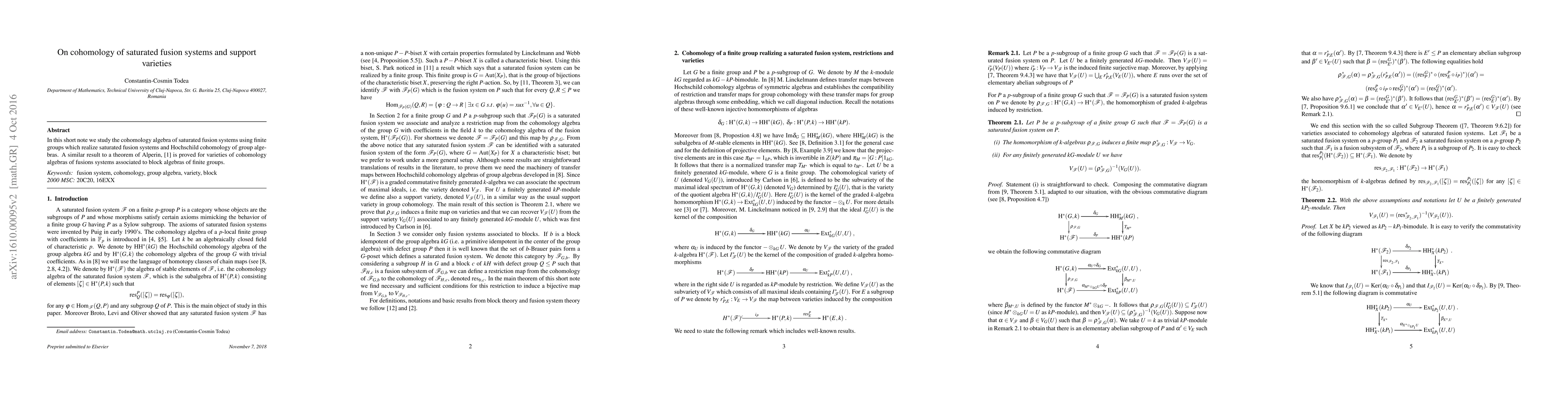 In this short note we study the cohomology algebra of saturated fusion systems using finite groups which realize saturated fusion systems and Hochschild cohomology of group algebras. A similar result to a theorem of Alperin is proved for varieties of cohomology algebras of fusions systems associated to block algebras of finite groups.
