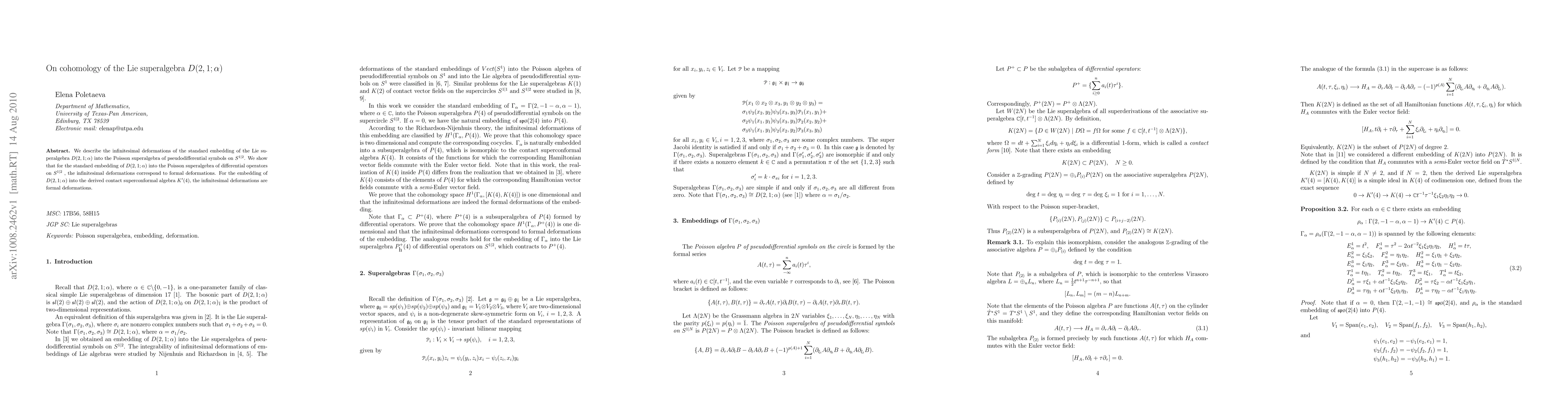 We describe the infinitesimal deformations of the standard embedding of the Lie superalgebra $D(2, 1 ; \alpha)$ into the Poisson superalgebra of pseudodifferential symbols on $S^{1|2}$. We show that for the standard embedding of $D(2, 1 ; \alpha)$ into the Poisson superalgebra of differential operators on $S^{1|2}$, the infinitesimal deformations correspond to formal deformations. For the embedding of $D(2, 1 ; \alpha)$ into the derived contact superconformal algebra ${K}'(4)$, the infinitesimal deformations are formal deformations.