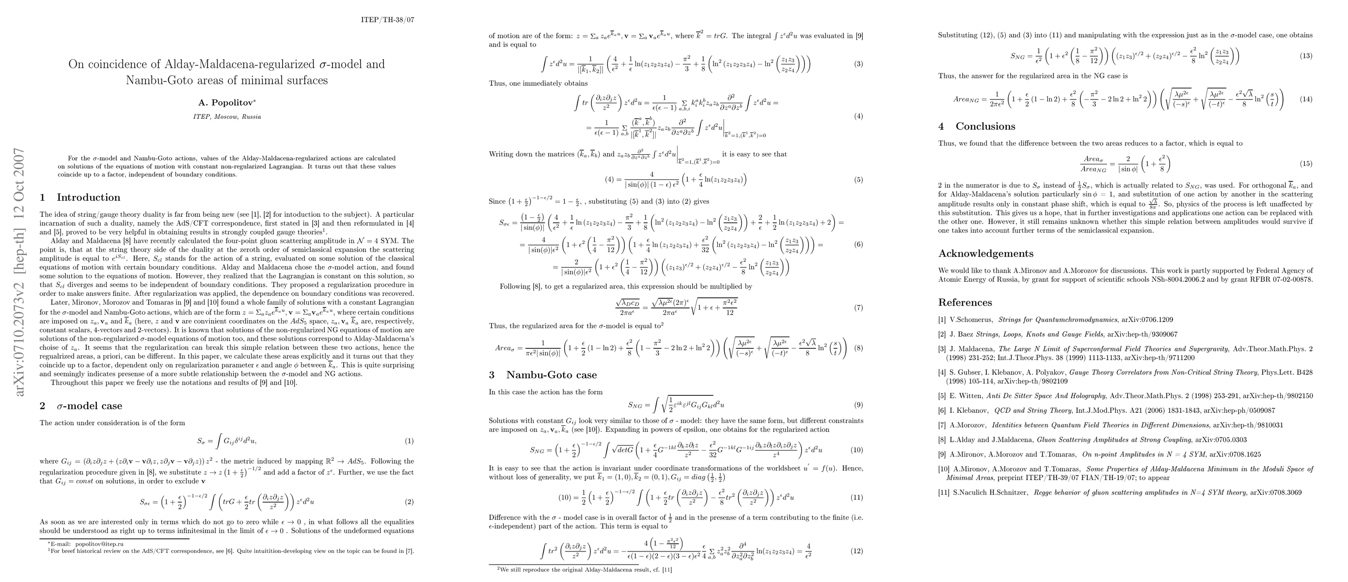 For the $\sigma$-model and Nambu-Goto actions, values of the Alday-Maldacena-regularized actions are calculated on solutions of the equations of motion with constant non-regularized Lagrangian. It turns out that these values coincide up to a factor, independent of boundary conditions.