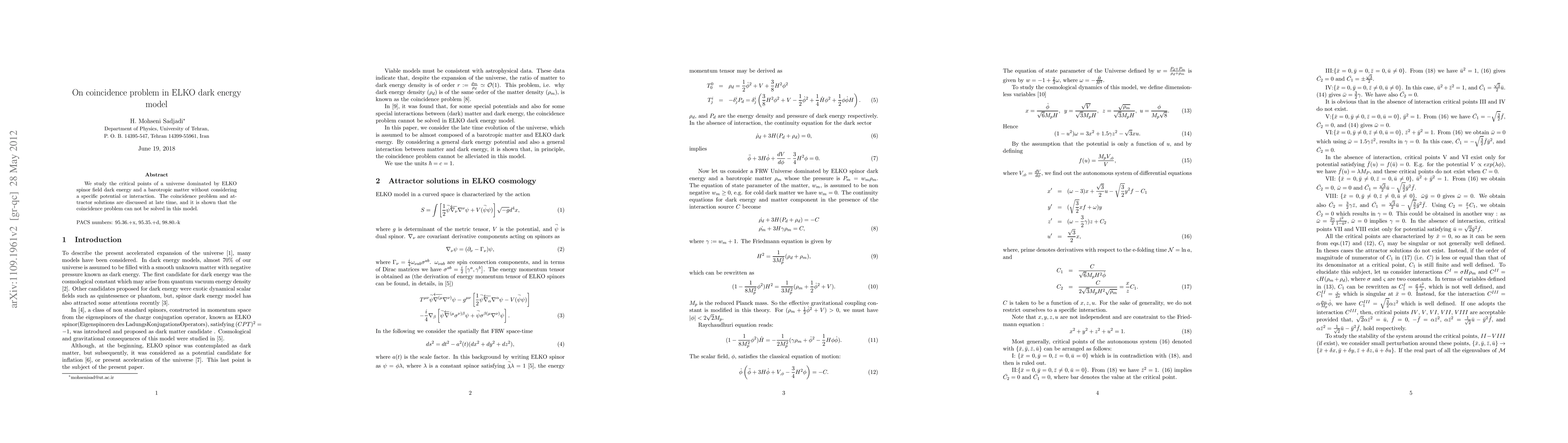 We study the critical points of a universe dominated by ELKO spinor field dark energy and a barotropic matter without considering a specific potential or interaction. The coincidence problem and attractor solutions are discussed at late time, and it is shown that the coincidence problem can not be solved in this model.
