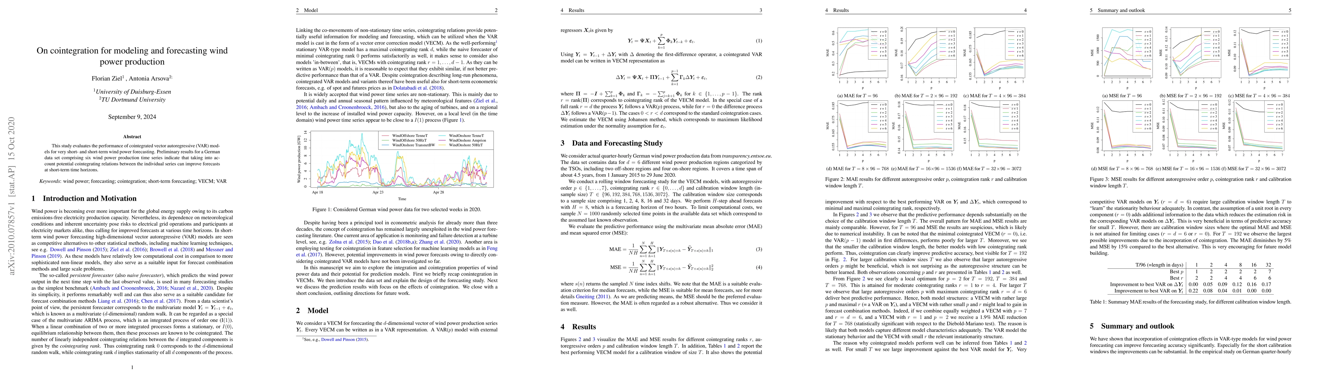 This study assesses the effectiveness of cointegrated vector autoregressive (VAR) models for short-term wind power forecasting, finding that incorporating cointegrating relationships among production time series enhances forecast accuracy for short-term horizons using a German data set.