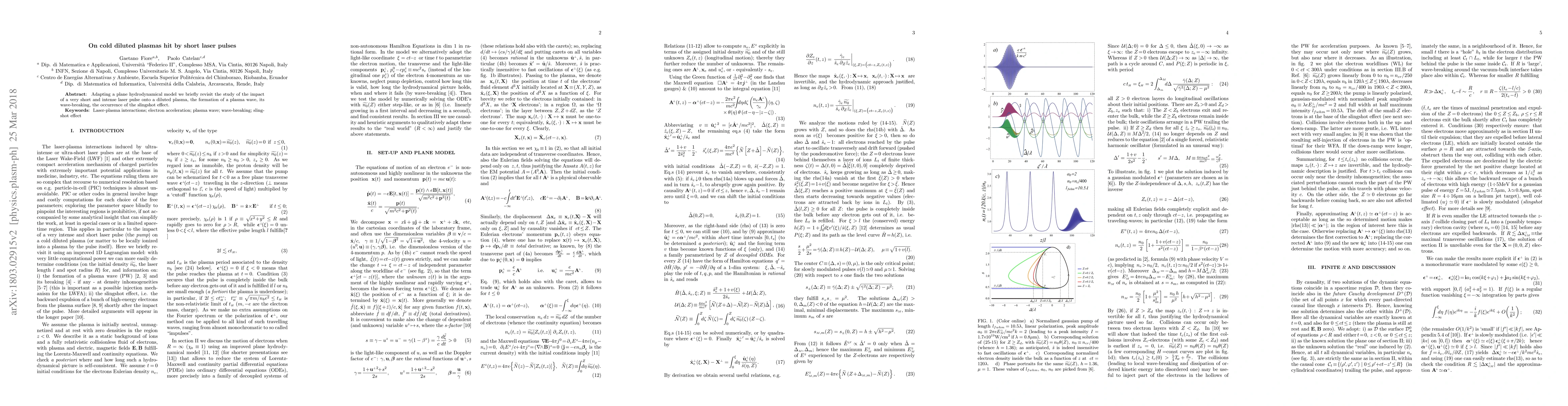 Adapting a plane hydrodynamical model we briefly revisit the study of the impact of a very short and intense laser pulse onto a diluted plasma, the formation of a plasma wave, its wave-breaking, the occurrence of the slingshot effect.