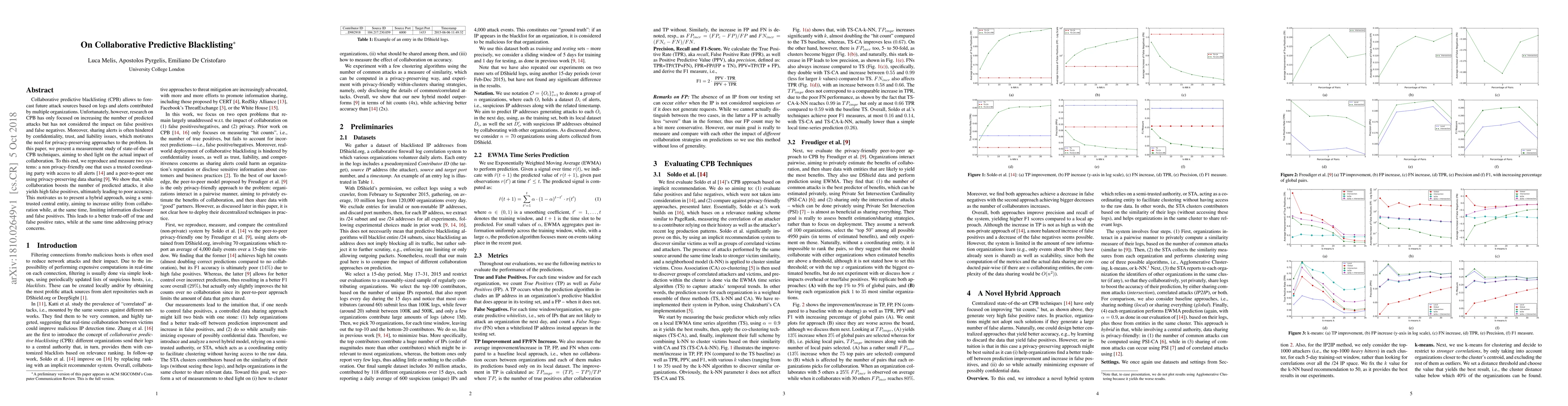 Collaborative predictive blacklisting (CPB) allows to forecast future attack sources based on logs and alerts contributed by multiple organizations. Unfortunately, however, research on CPB has only focused on increasing the number of predicted attacks but has not considered the impact on false positives and false negatives. Moreover, sharing alerts is often hindered by confidentiality, trust, and liability issues, which motivates the need for privacy-preserving approaches to the problem. In this paper, we present a measurement study of state-of-the-art CPB techniques, aiming to shed light on the actual impact of collaboration. To this end, we reproduce and measure two systems: a non privacy-friendly one that uses a trusted coordinating party with access to all alerts (Soldo et al., 2010) and a peer-to-peer one using privacy-preserving data sharing (Freudiger et al., 2015). We show that, while collaboration boosts the number of predicted attacks, it also yields high false positives, ultimately leading to poor accuracy. This motivates us to present a hybrid approach, using a semi-trusted central entity, aiming to increase utility from collaboration while, at the same time, limiting information disclosure and false positives. This leads to a better trade-off of true and false positive rates, while at the same time addressing privacy concerns.