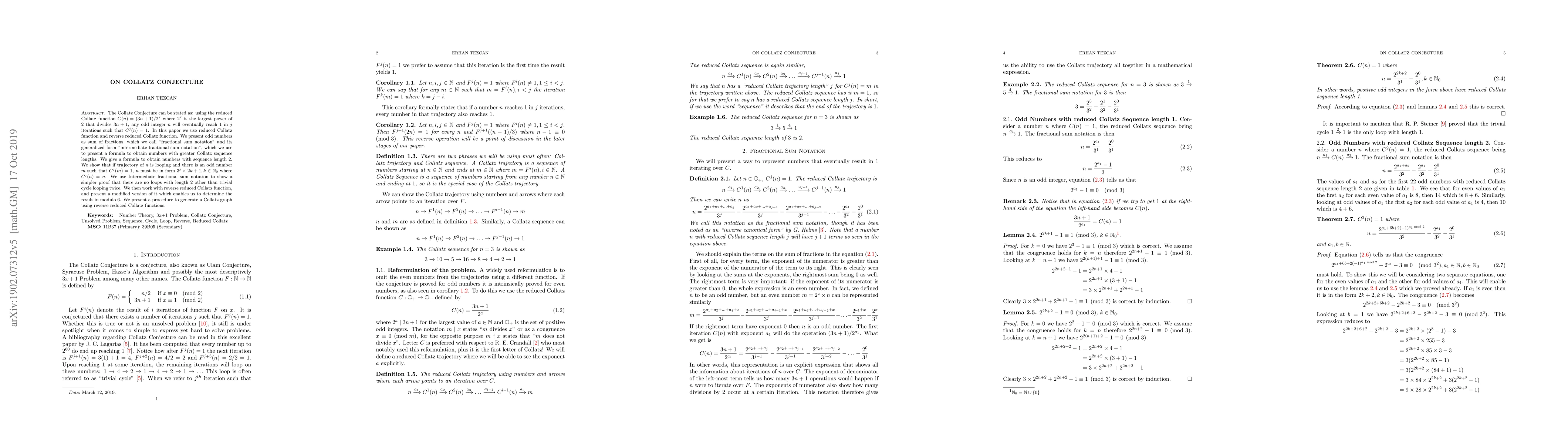 The Collatz Conjecture can be stated as: using the reduced Collatz function $C(n) = (3n+1)/2^x$ where $2^x$ is the largest power of 2 that divides $3n+1$, any odd integer $n$ will eventually reach 1 in $j$ iterations such that $C^j(n) = 1$. In this paper we use reduced Collatz function and reverse reduced Collatz function. We present odd numbers as sum of fractions, which we call `fractional sum notation' and its generalized form `intermediate fractional sum notation', which we use to present a formula to obtain numbers with greater Collatz sequence lengths. We give a formula to obtain numbers with sequence length 2. We show that if trajectory of $n$ is looping and there is an odd number $m$ such that $C^j(m) = 1$, $n$ must be in form $3^j\times2k + 1, k \in \mathbb{N}_0$ where $C^j(n) = n$. We use Intermediate fractional sum notation to show a simpler proof that there are no loops with length 2 other than trivial cycle looping twice. We then work with reverse reduced Collatz function, and present a modified version of it which enables us to determine the result in modulo 6. We present a procedure to generate a Collatz graph using reverse reduced Collatz functions.