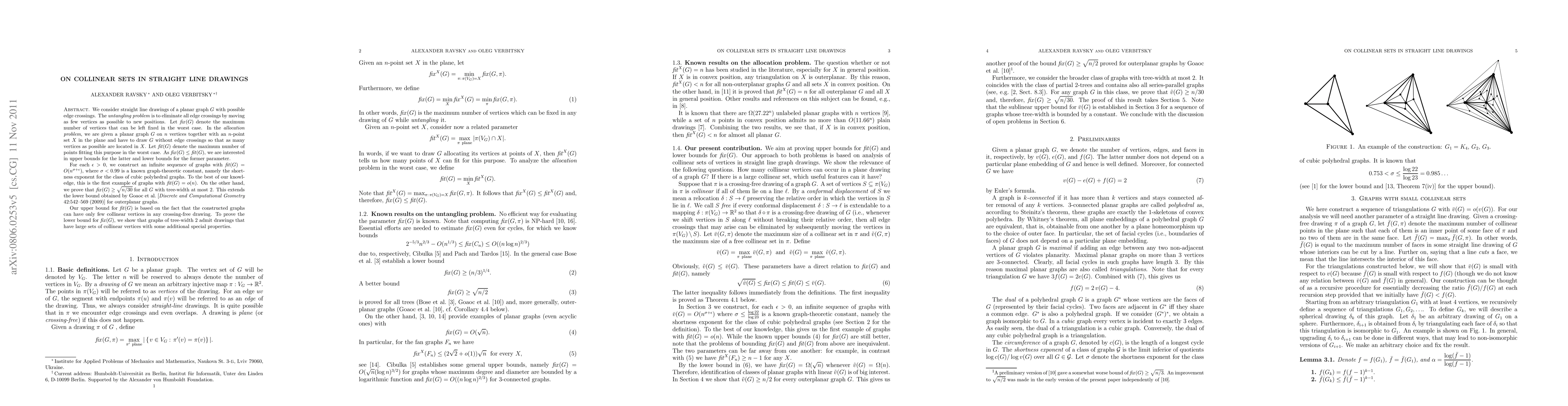 We consider straight line drawings of a planar graph $G$ with possible edge crossings. The \emph{untangling problem} is to eliminate all edge crossings by moving as few vertices as possible to new positions. Let $fix(G)$ denote the maximum number of vertices that can be left fixed in the worst case. In the \emph{allocation problem}, we are given a planar graph $G$ on $n$ vertices together with an $n$-point set $X$ in the plane and have to draw $G$ without edge crossings so that as many vertices as possible are located in $X$. Let $fit(G)$ denote the maximum number of points fitting this purpose in the worst case. As $fix(G)\le fit(G)$, we are interested in upper bounds for the latter and lower bounds for the former parameter. For each $\epsilon>0$, we construct an infinite sequence of graphs with $fit(G)=O(n^{\sigma+\epsilon})$, where $\sigma<0.99$ is a known graph-theoretic constant, namely the shortness exponent for the class of cubic polyhedral graphs. To the best of our knowledge, this is the first example of graphs with $fit(G)=o(n)$. On the other hand, we prove that $fix(G)\ge\sqrt{n/30}$ for all $G$ with tree-width at most 2. This extends the lower bound obtained by Goaoc et al. [Discrete and Computational Geometry 42:542-569 (2009)] for outerplanar graphs. Our upper bound for $fit(G)$ is based on the fact that the constructed graphs can have only few collinear vertices in any crossing-free drawing. To prove the lower bound for $fix(G)$, we show that graphs of tree-width 2 admit drawings that have large sets of collinear vertices with some additional special properties.