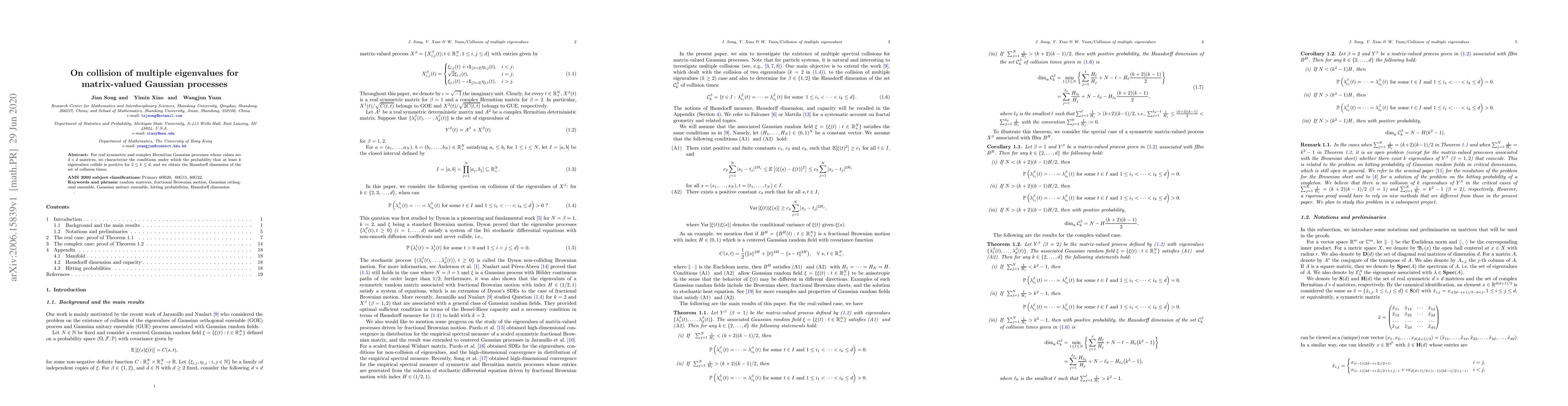 For real symmetric and complex Hermitian Gaussian processes whose values are $d\times d$ matrices, we characterize the conditions under which the probability that at least $k$ eigenvalues collide is positive for $2\le k\le d$, and we obtain the Hausdorff dimension of the set of collision times.