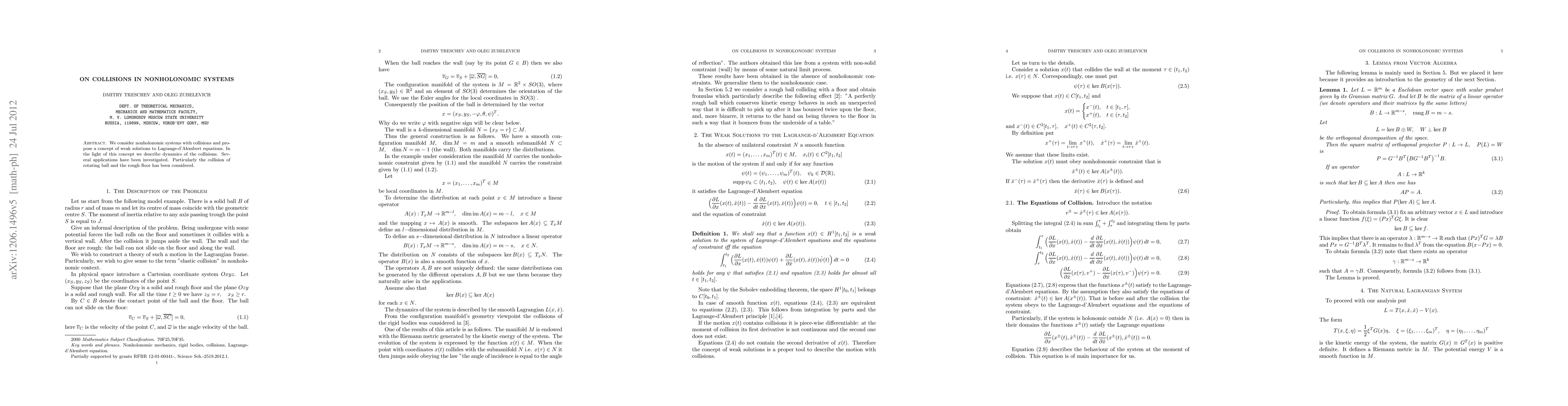 We consider nonholonomic systems with collisions and propose a concept of weak solutions to Lagrange-d'Alembert equations. In the light of this concept we describe dynamics of the collisions. Several applications have been investigated. Particularly the collision of rotating ball and the rough floor has been considered.