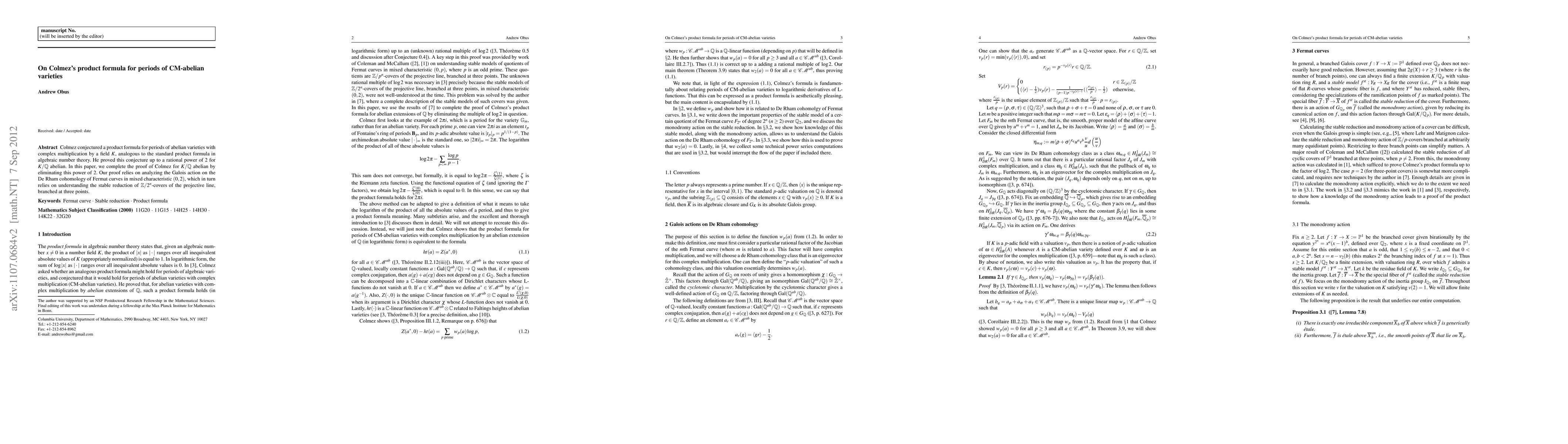 Colmez conjectured a product formula for periods of abelian varieties with complex multiplication by a field K, analogous to the standard product formula in algebraic number theory. He proved this conjecture up to a rational power of 2 for K/Q abelian. In this paper, we complete the proof of Colmez for K/Q abelian by eliminating this power of 2. Our proof relies on analyzing the Galois action on the De Rham cohomology of Fermat curves in mixed characteristic (0, 2), which in turn relies on understanding the stable reduction of Z/2^n-covers of the projective line, branched at three points.