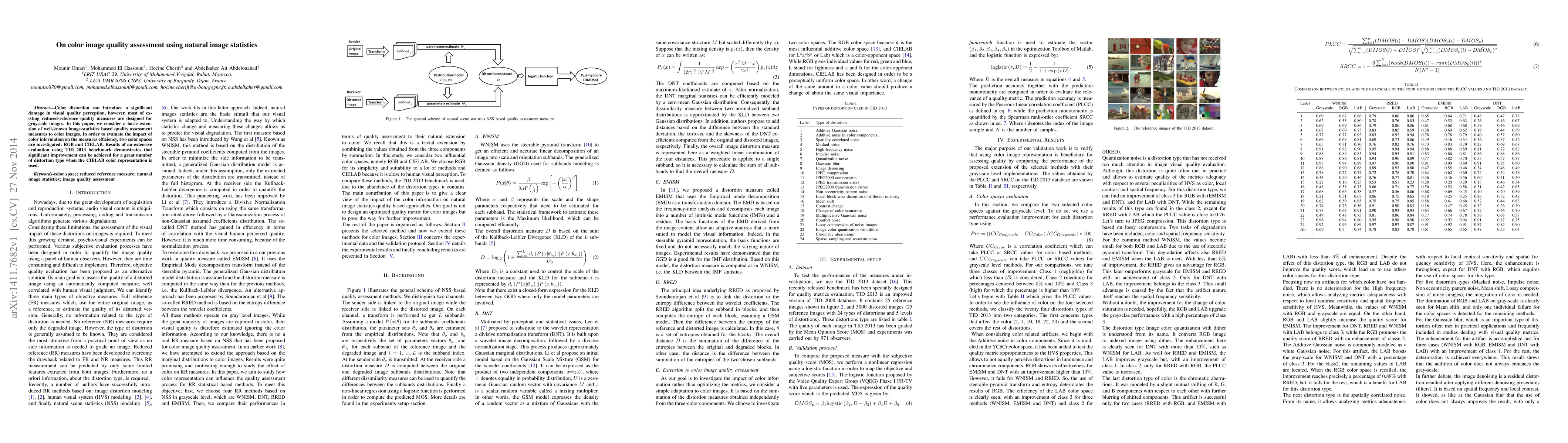 This paper extends well-known image-statistics based quality assessment measures to color images, evaluating their efficiency in RGB and CIELAB color spaces. Results show significant improvement in assessing color distortion using CIELAB, as demonstrated by the TID 2013 benchmark.