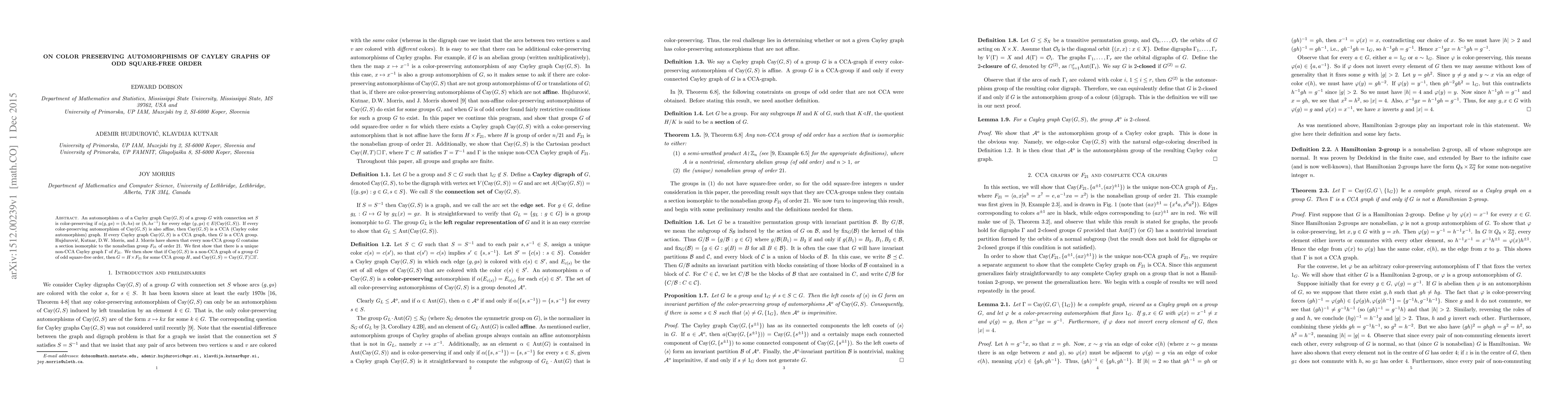 An automorphism $\alpha$ of a Cayley graph $Cay(G,S)$ of a group $G$ with connection set $S$ is color-preserving if $\alpha(g,gs) = (h,hs)$ or $(h,hs^{-1})$ for every edge $(g,gs)\in E(Cay(G,S))$. If every color-preserving automorphism of $Cay(G,S)$ is also affine, then $Cay(G,S)$ is a CCA (Cayley color automorphism) graph. If every Cayley graph $Cay(G,S)$ is a CCA graph, then $G$ is a CCA group. Hujdurovi\'c, Kutnar, D.W. Morris, and J. Morris have shown that every non-CCA group $G$ contains a section isomorphic to the nonabelian group $F_{21}$ of order $21$. We first show that there is a unique non-CCA Cayley graph $\Gamma$ of $F_{21}$. We then show that if $Cay(G,S)$ is a non-CCA graph of a group $G$ of odd square-free order, then $G = H\times F_{21}$ for some CCA group $H$, and $Cay(G,S) = Cay(G,T)\Box\Gamma$.