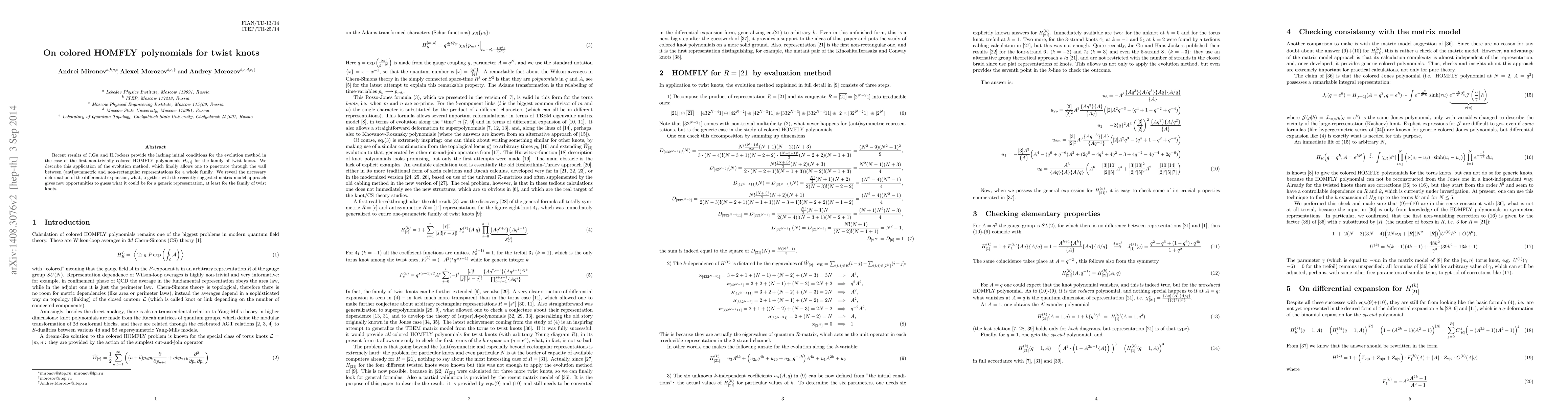 Summary: J.Gu and H.Jockers' recent findings supply essential initial conditions for applying the evolution method to the first non-trivially colored HOMFLY polynomials H_{[21]} in twist knots. This enables a comprehensive analysis of both symmetric and non-rectangular representations for this knot family, aided by a necessary deformation of the differential expansion and a matrix model approach.