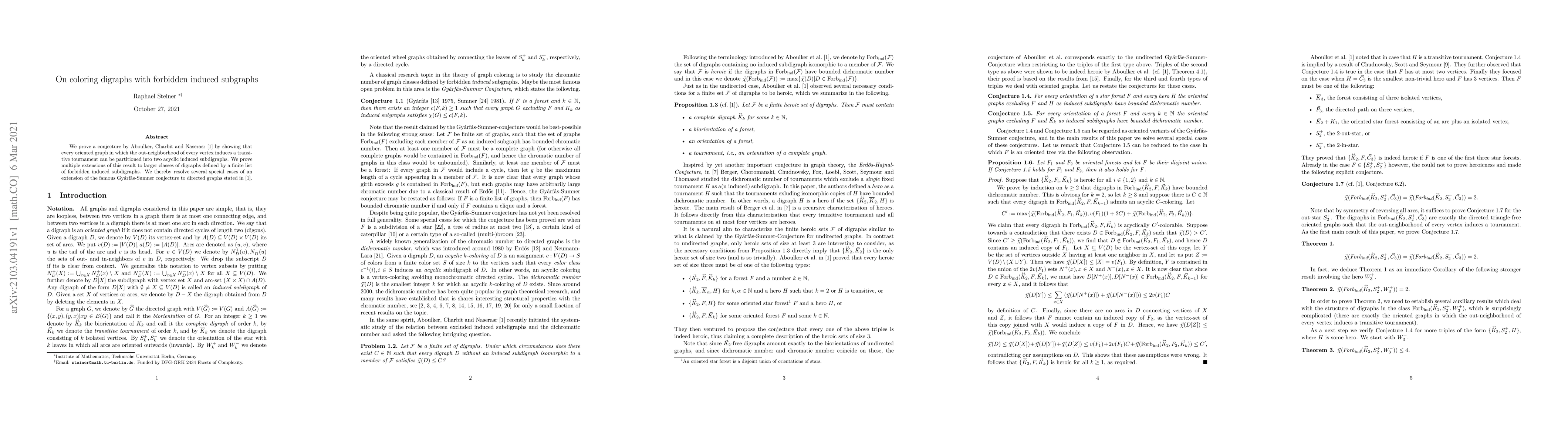 This paper proves a conjecture regarding the coloring of digraphs where the out-neighborhood of each vertex forms a transitive tournament, showing they can be divided into two acyclic induced subdigraphs. It also extends this result to broader classes of digraphs defined by forbidden induced subgraphs, resolving several special cases of an extended Gyárfás-Sumner conjecture for directed graphs.
