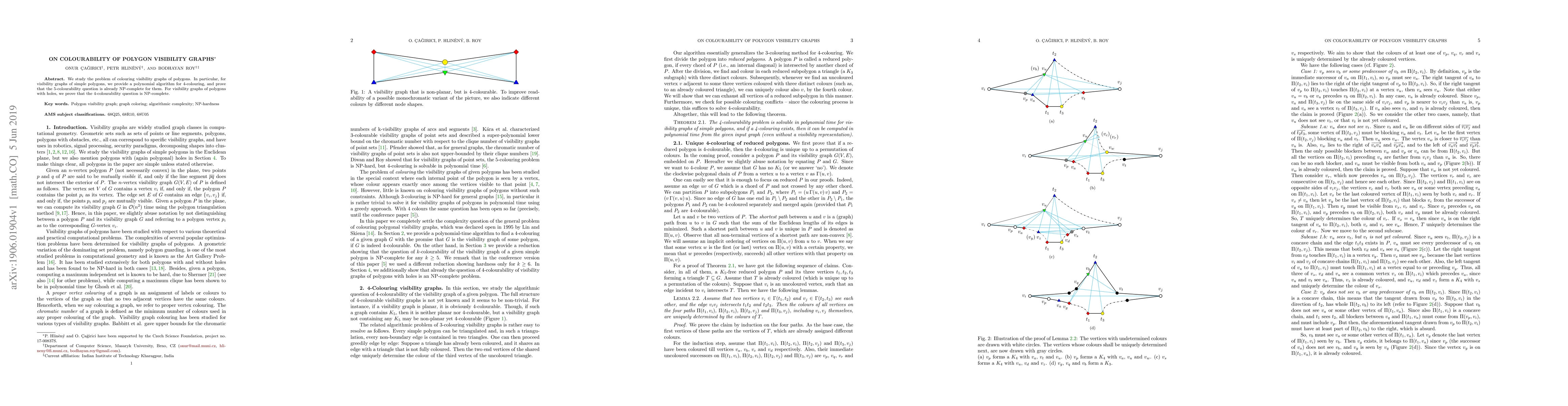 Summary: This paper presents a polynomial algorithm for 4-colouring visibility graphs of simple polygons and proves that determining 5-colourability is NP-complete. It also establishes that 4-colourability for visibility graphs of polygons with holes is NP-complete.