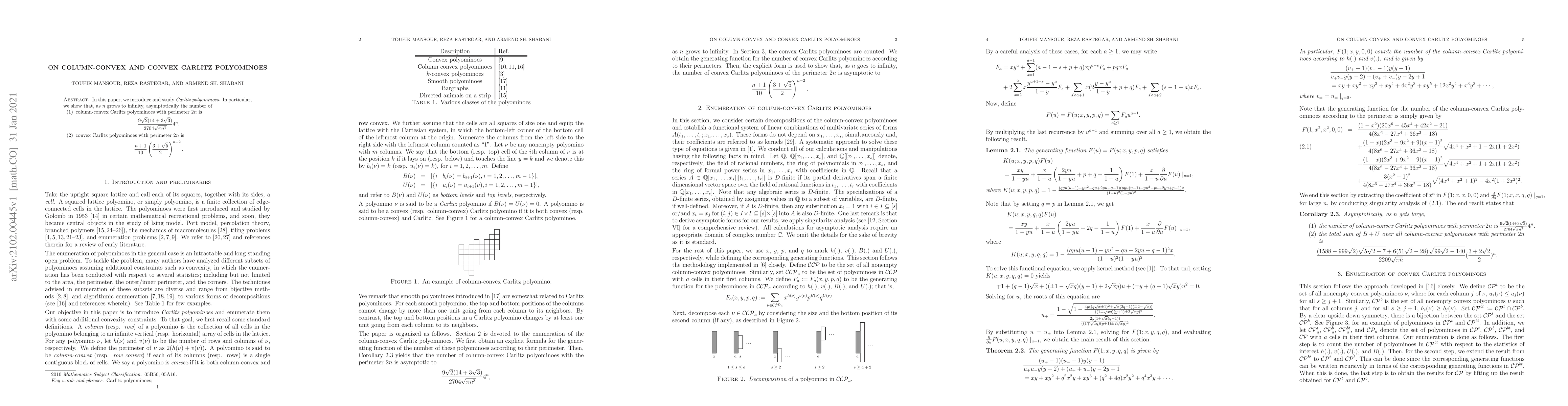 In this paper, we introduce and study {\it Carlitz polyominoes}. In particular, we show that, as $n$ grows to infinity, asymptotically the number of \begin{enumerate} \item column-convex Carlitz polyominoes with perimeter $2n$ is \beq \frac{9\sqrt{2}(14+3\sqrt{3})}{2704\sqrt{\pi n^3}}4^n. \feq \item convex Carlitz polyominoes with perimeter $2n$ is \beq \frac{n+1}{10}\left(\frac{3+\sqrt{5}}{2}\right)^{n-2}. \feq \end{enumerate}