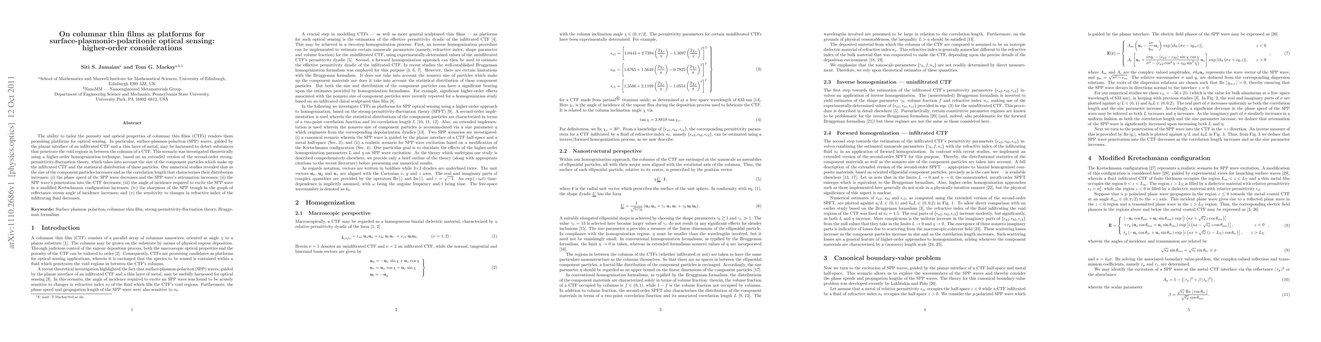 This research uses higher-order homogenization to study surface-plasmon-polariton (SPP) waves in columnar thin films (CTFs) for optical sensing. Findings show that larger component particles and higher correlation lengths in CTFs decrease SPP wave speed, increase attenuation, reduce penetration, raise required incidence angle, sharpen SPP trough, but lower sensitivity to refractive index changes of infiltrating fluids.