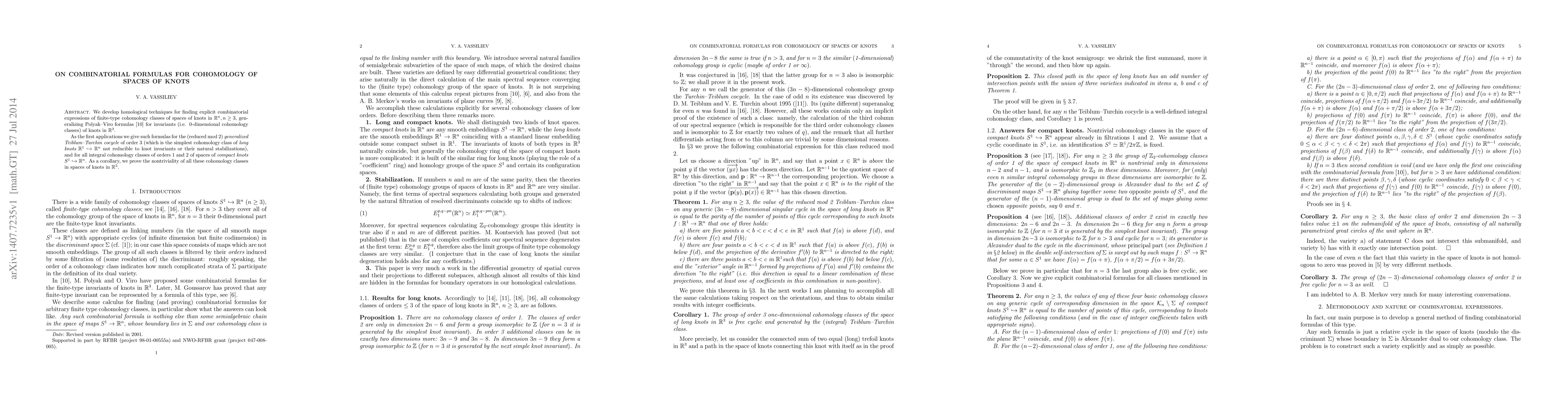 The paper develops new combinatorial formulas for the cohomology of spaces of knots in higher dimensions, extending Polyak-Viro formulas for knot invariants. It provides explicit expressions for generalized Teiblum-Turchin cocycles and integral cohomology classes of compact knots, proving their nontriviality in spaces of knots in $\mathbb{R}^3$.