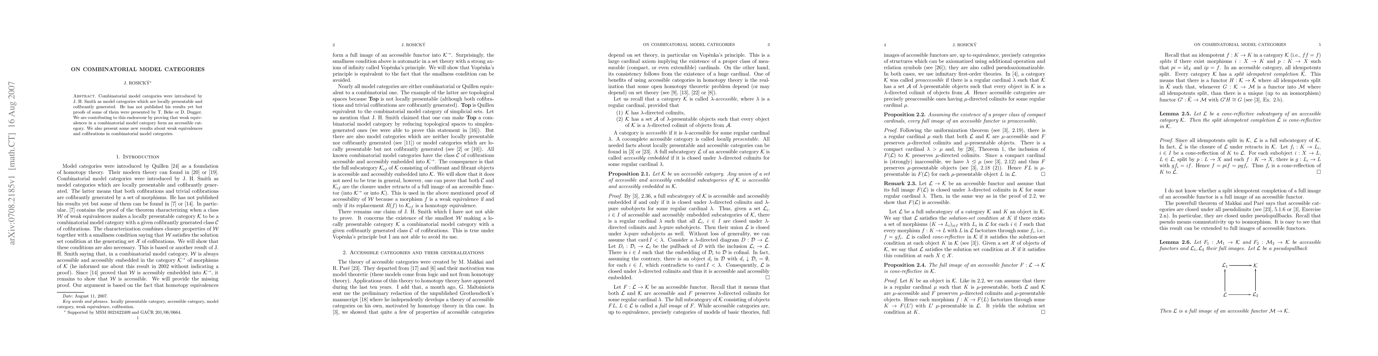 Combinatorial model categories were introduced by J. H. Smith as model categories which are locally presentable and cofibrantly generated. He has not published his results yet but proofs of some of them were presented by T. Beke or D. Dugger. We are contributing to this endeavour by proving that weak equivalences in a combinatorial model category form an accessible category. We also present some new results about weak equivalences and cofibrations in combinatorial model categories.