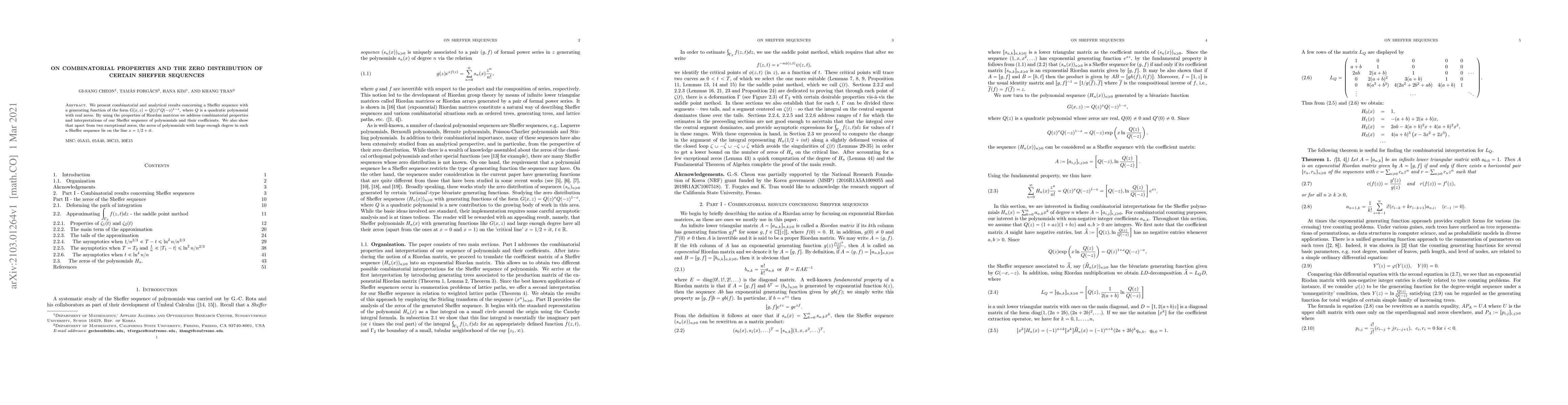 We present combinatorial and analytical results concerning a Sheffer sequence with a generating function of the form $G(x,z)=Q(z)^{x}Q(-z)^{1-x}$, where $Q$ is a quadratic polynomial with real zeros. By using the properties of Riordan matrices we address combinatorial properties and interpretations of our Sheffer sequence of polynomials and their coefficients. We also show that apart from two exceptional zeros, the zeros of polynomials with large enough degree in such a Sheffer sequence lie on the line $x=1/2+it$.