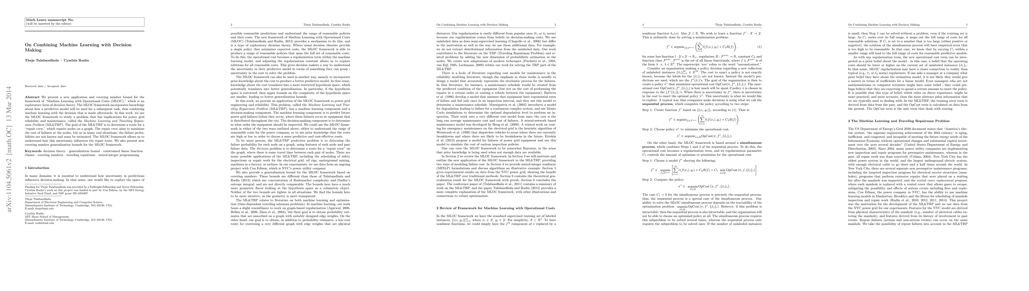 We present a new application and covering number bound for the framework of "Machine Learning with Operational Costs (MLOC)," which is an exploratory form of decision theory. The MLOC framework incorporates knowledge about how a predictive model will be used for a subsequent task, thus combining machine learning with the decision that is made afterwards. In this work, we use the MLOC framework to study a problem that has implications for power grid reliability and maintenance, called the Machine Learning and Traveling Repairman Problem ML&TRP. The goal of the ML&TRP is to determine a route for a "repair crew," which repairs nodes on a graph. The repair crew aims to minimize the cost of failures at the nodes, but as in many real situations, the failure probabilities are not known and must be estimated. The MLOC framework allows us to understand how this uncertainty influences the repair route. We also present new covering number generalization bounds for the MLOC framework.