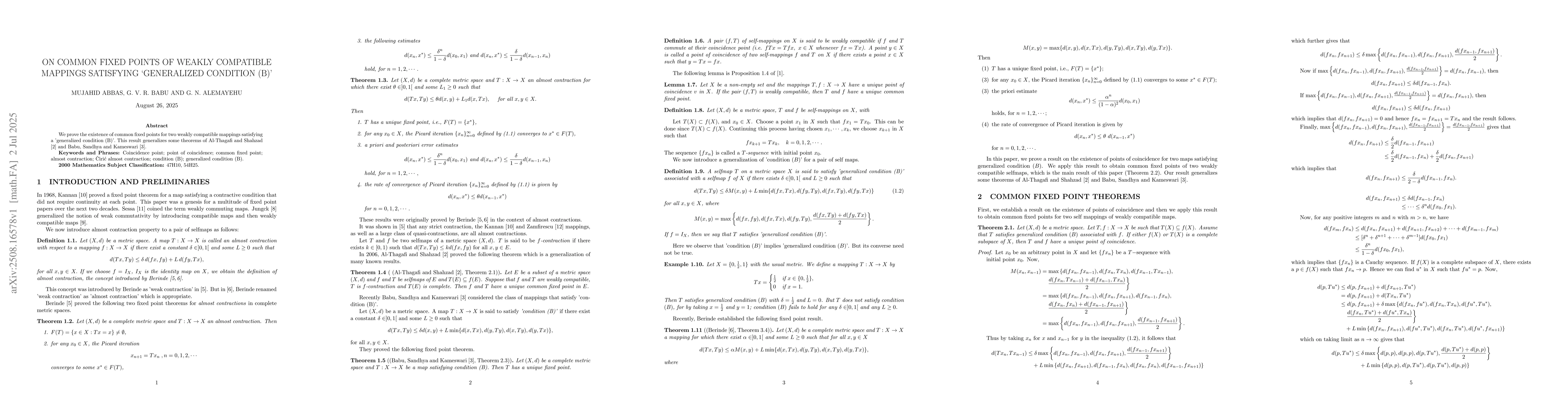 We prove the existence of common fixed points for two weakly compatible mappings satisfying a 'generalized condition (B)'. This result generalizes some theorems of Al-Thagafi and Shahzad \cite{AlThagafi2006} and Babu, Sandhya and Kameswari \cite{Babu2008}.