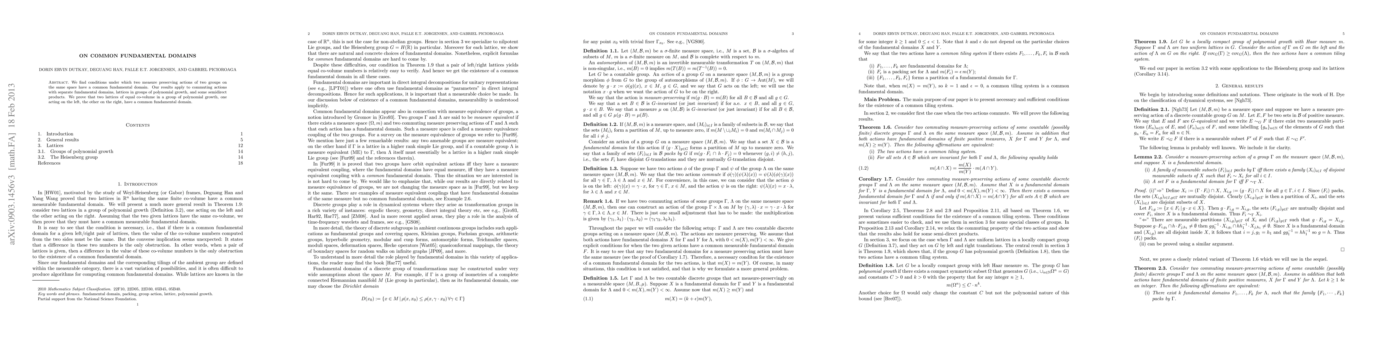 Two measure-preserving actions of groups on the same space have a common fundamental domain under specific conditions, including commuting actions with separate domains and lattices in groups of polynomial growth.
