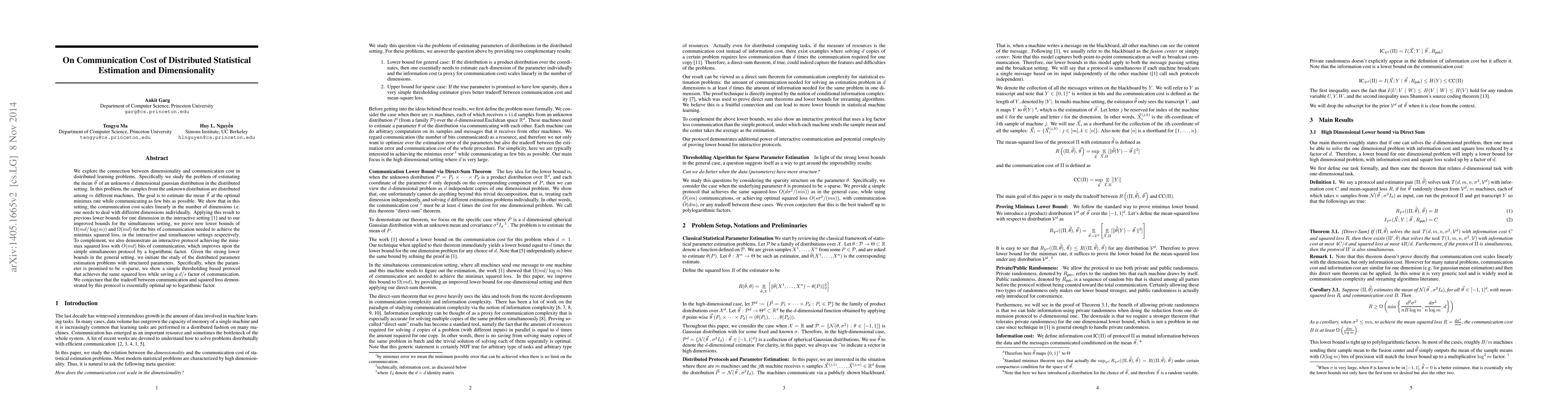 This research paper investigates the relationship between dimensionality and communication cost in distributed statistical estimation, focusing on estimating the mean of a Gaussian distribution. It reveals that communication cost scales linearly with dimension, providing new lower bounds for interactive and simultaneous settings. The paper also presents an interactive protocol reducing communication cost by a logarithmic factor and explores structured parameters, demonstrating a thresholding-based protocol for sparse parameters, conjecturing near-optimality up to logarithmic factors.