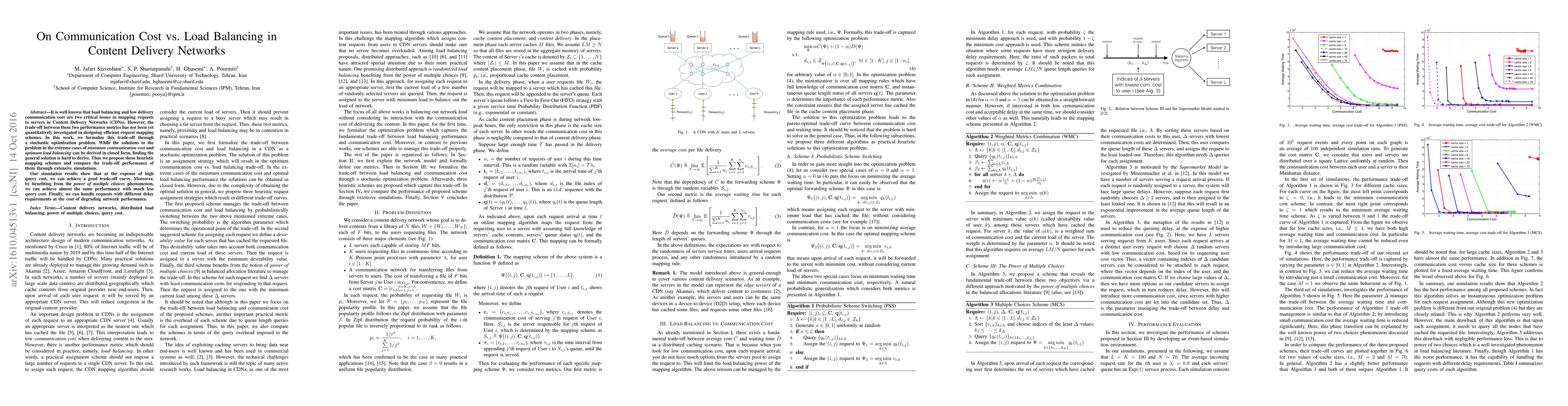 This paper investigates the trade-off between communication cost and load balancing in Content Delivery Networks (CDNs) through a stochastic optimization problem. It proposes three heuristic mapping schemes and demonstrates via simulations that achieving a good trade-off often requires higher query costs, but multiple choices can nearly match performance with lower query costs.