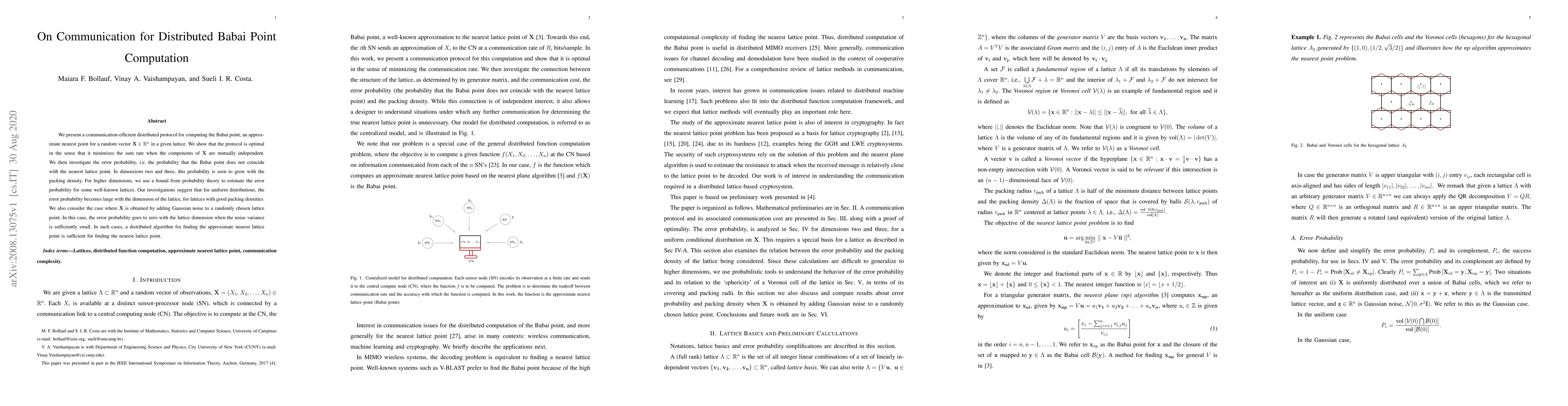 We present a communication-efficient distributed protocol for computing the Babai point, an approximate nearest point for a random vector ${\bf X}\in\mathbb{R}^n$ in a given lattice. We show that the protocol is optimal in the sense that it minimizes the sum rate when the components of ${\bf X}$ are mutually independent. We then investigate the error probability, i.e. the probability that the Babai point does not coincide with the nearest lattice point. In dimensions two and three, this probability is seen to grow with the packing density. For higher dimensions, we use a bound from probability theory to estimate the error probability for some well-known lattices. Our investigations suggest that for uniform distributions, the error probability becomes large with the dimension of the lattice, for lattices with good packing densities. We also consider the case where $\mathbf{X}$ is obtained by adding Gaussian noise to a randomly chosen lattice point. In this case, the error probability goes to zero with the lattice dimension when the noise variance is sufficiently small. In such cases, a distributed algorithm for finding the approximate nearest lattice point is sufficient for finding the nearest lattice point.