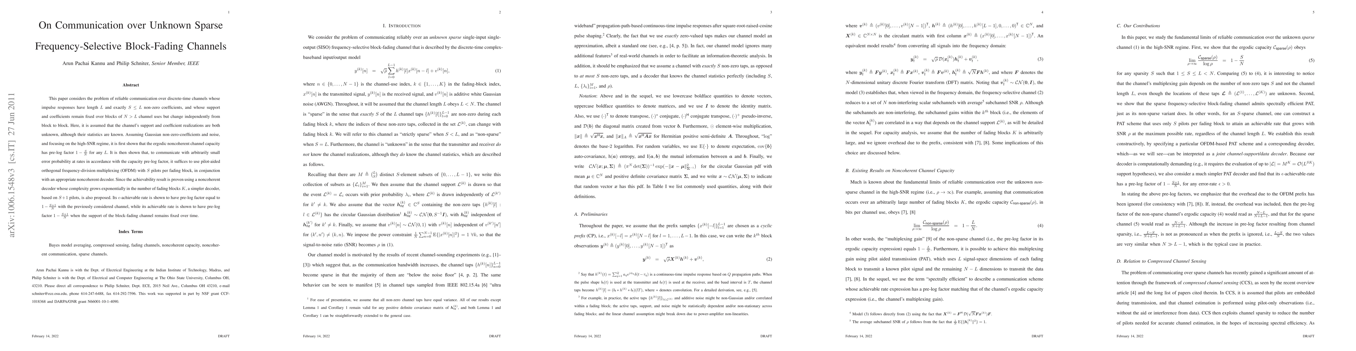 This paper explores reliable communication over unknown sparse frequency-selective block-fading channels, demonstrating that the ergodic noncoherent channel capacity has a pre-log factor of $1-\frac{S}{N}$ in the high-SNR regime. It proposes pilot-aided OFDM with $S$ pilots per fading block for achieving near-capacity rates with small error probability.