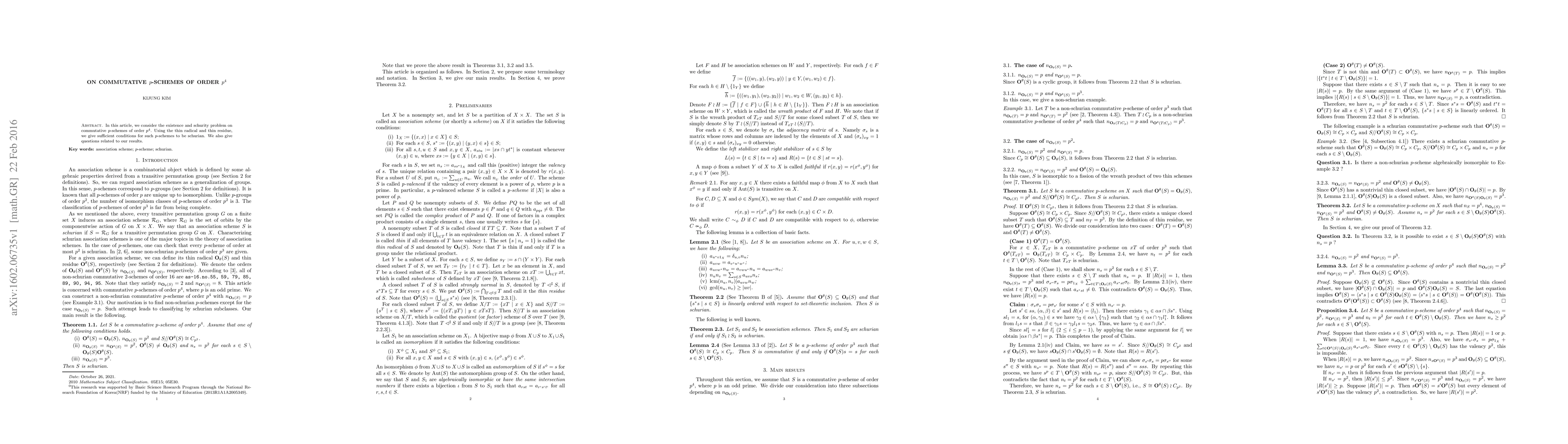 In this article, we consider the existence and schurity problem on commutative $p$-schemes of order $p^4$. Using the thin radical and thin residue, we give sufficient conditions for such $p$-schemes to be schurian. We also give questions related to our results.