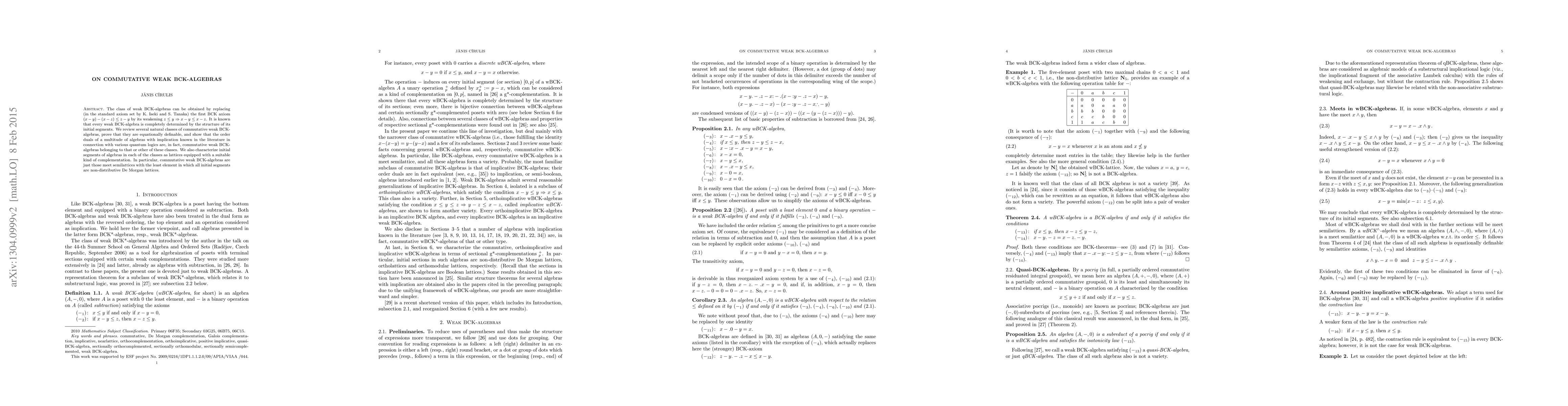 This paper explores commutative weak BCK-algebras, proving their equational definability and showing their connection to various quantum logics. It characterizes their initial segments as lattices with specific complementation, revealing that they are meet semilattices with non-distributive de Morgan lattices.