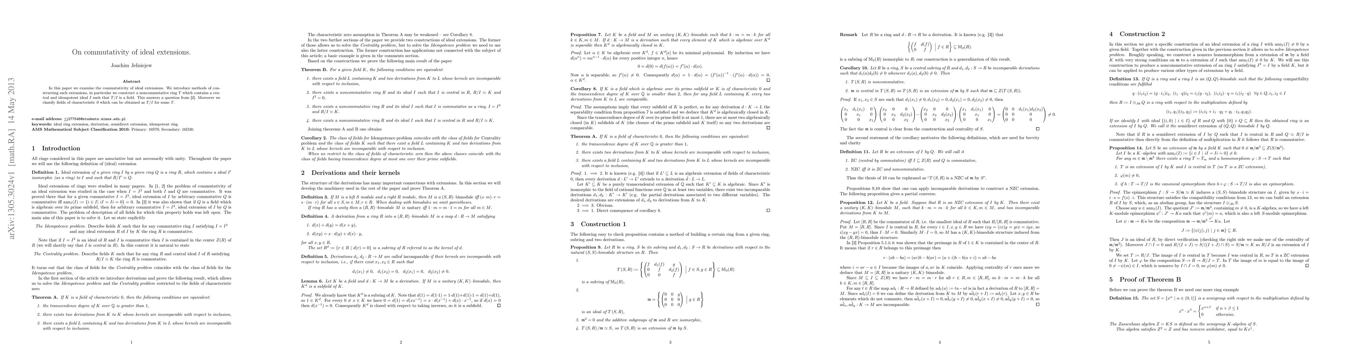 This paper explores the commutativity of ideal extensions by constructing noncommutative rings containing central idempotent ideals, demonstrating that T/I can be a field. It also classifies fields of characteristic 0 obtainable as T/I for some T, answering a question from a referenced work.