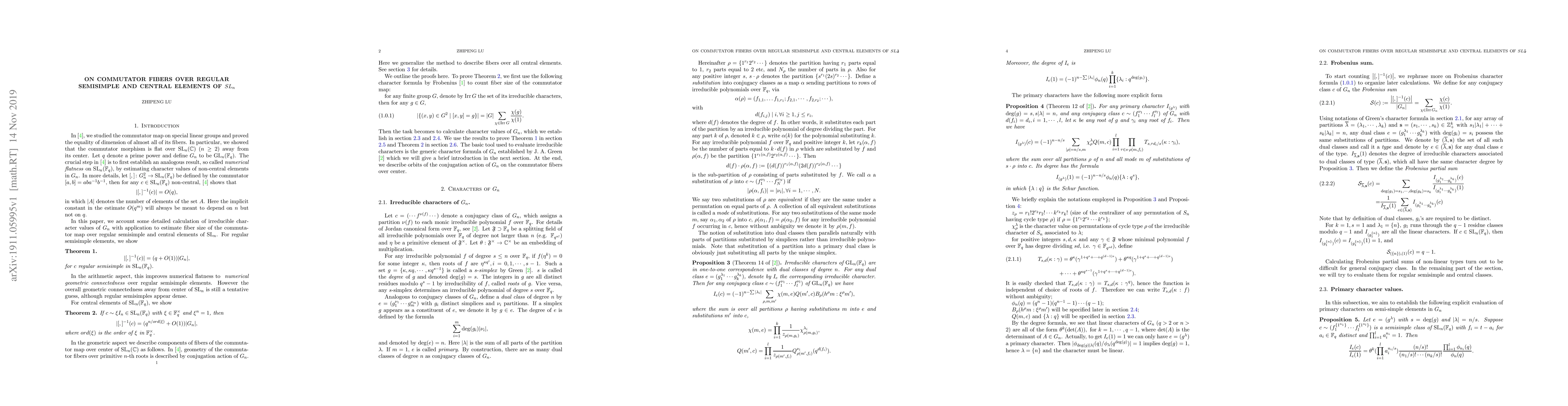 We account some detailed calculation of irreducible character values of $G_n$ with application to estimate fiber size of the commutator map over regular semisimple and central elements of $\SL_n$.