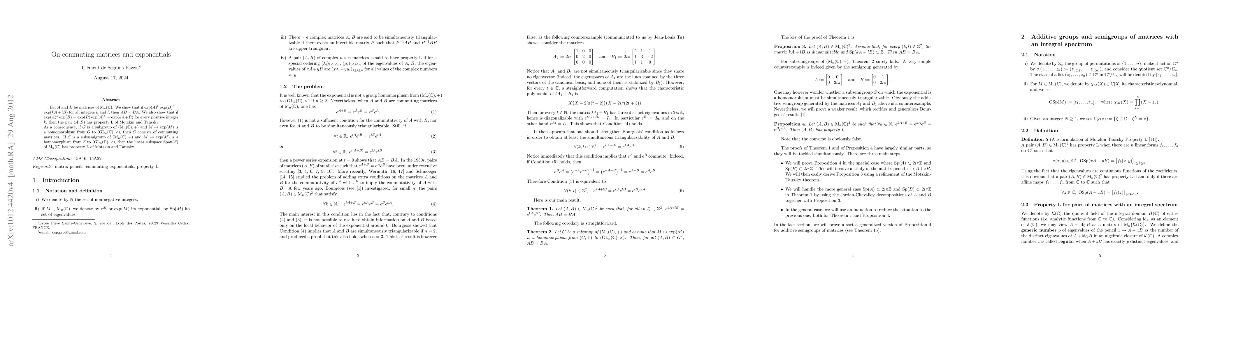 Let A and B be matrices of M_n(C). We show that if exp(A)^k exp(B)^l=exp(kA+lB) for all integers k and l, then AB=BA. We also show that if exp(A)^k exp(B)=exp(B)exp(A)^k=exp(kA+B)$ for every positive integer k, then the pair (A,B) has property L of Motzkin and Taussky. As a consequence, if G is a subgroup of (M_n(C),+) and M -> exp(M) is a homomorphism from G to (GL_n(C),x), then G consists of commuting matrices. If S is a subsemigroup of (M_n(C),+) and M -> exp(M) is a homomorphism from S to (GL_n(C),x), then the linear subspace Span(S) of M_n(C) has property L of Motzkin and Taussky.