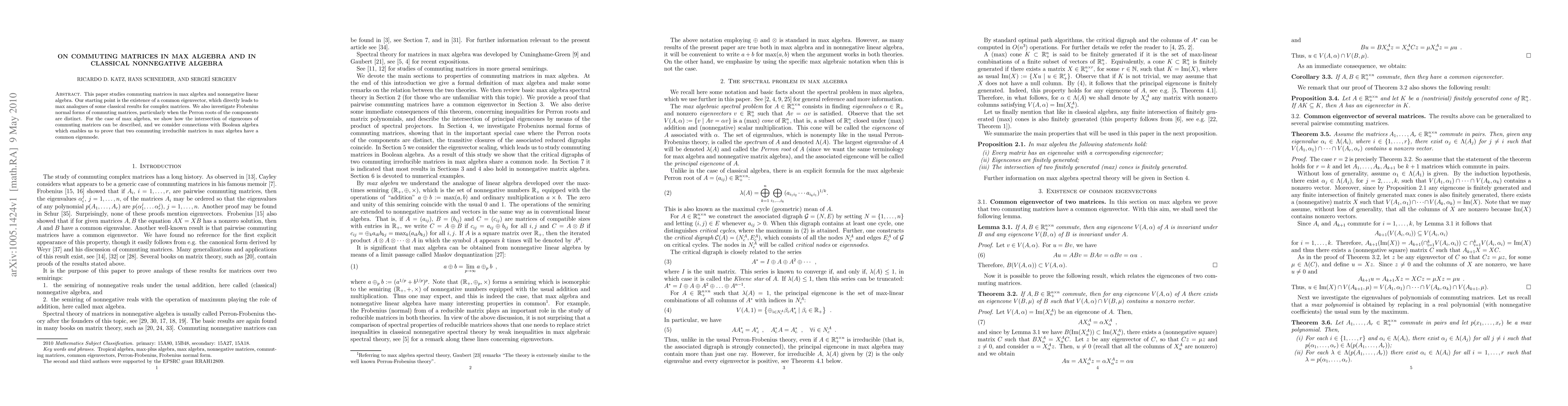 This paper explores commuting matrices in max algebra and nonnegative linear algebra, focusing on the existence of common eigenvectors and their implications. It also examines Frobenius normal forms and the intersection of eigencones, revealing connections to Boolean algebra and proving that two commuting irreducible matrices in max algebra share a common eigennode.